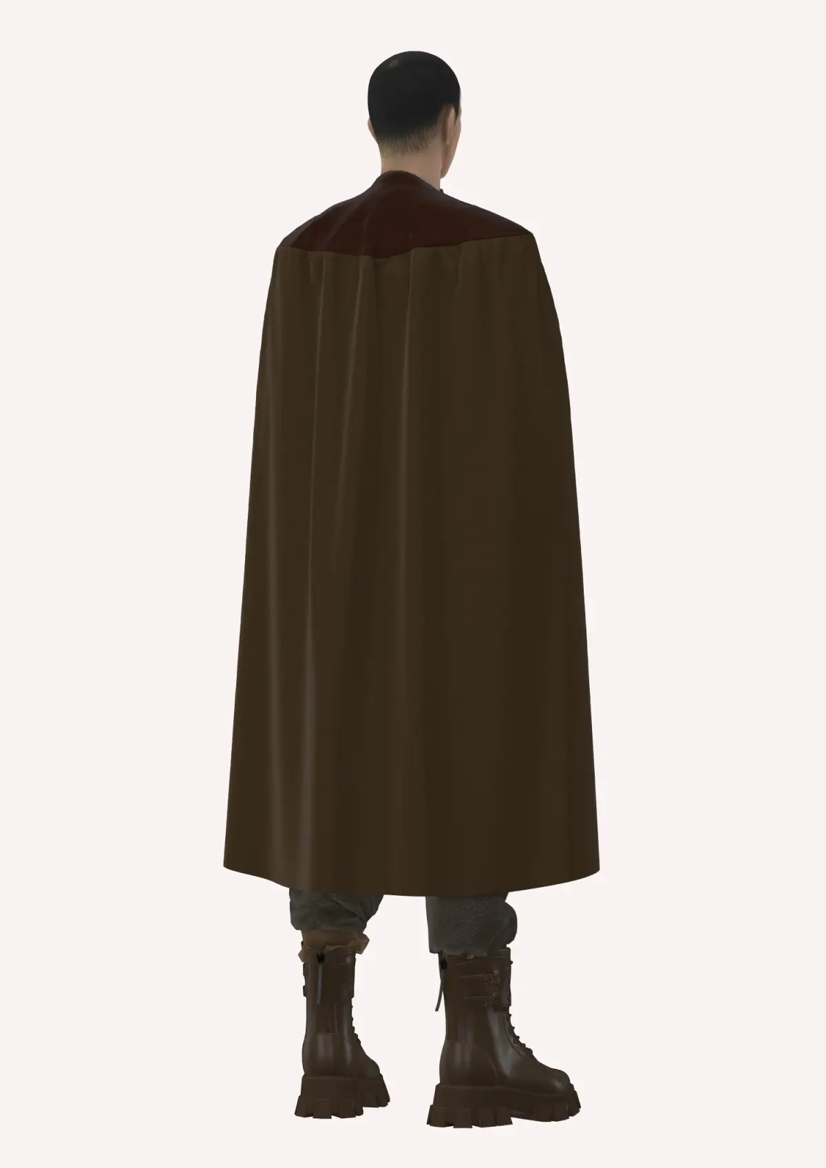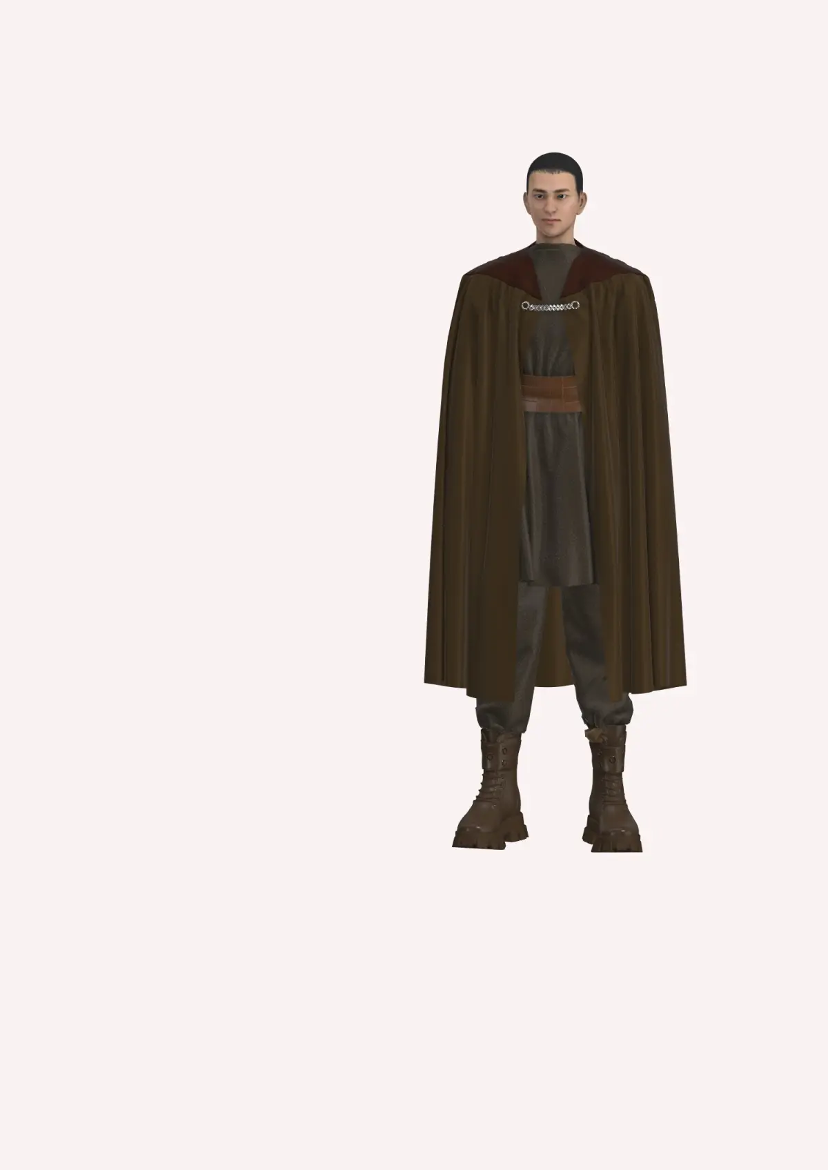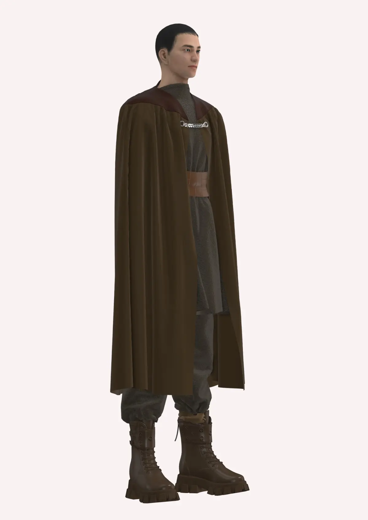 This Sith-inspired garment, created in Style3d Atelier, features a layered, earthy-toned aesthetic, reminiscent of traditional robes. The cape, in a rich, dark brown fabric, flows gracefully from the shoulders to right below the knee. The high neckline is accented by a metal clasp that adds a refined touch while providing a secure fit. The inner tunic, in a muted, textured fabric, complements the outer layer, contributing to a rugged yet spiritual look. A broad, leather belt cinches the waist, adding structure and highlighting the warrior-monk influence. The tapered pants match the tunic and tuck neatly into sturdy, high-tread brown boots, perfect for any terrain.