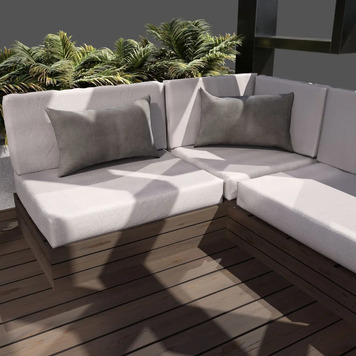 A high-quality 3D model of a modern outdoor pergola featuring a sleek metal structure with wooden slatted roof panels, a spacious wooden deck, and built-in corner lounge sofas. Ideal for rooftop terraces, garden patios, or luxury resort environments.
