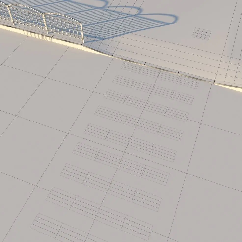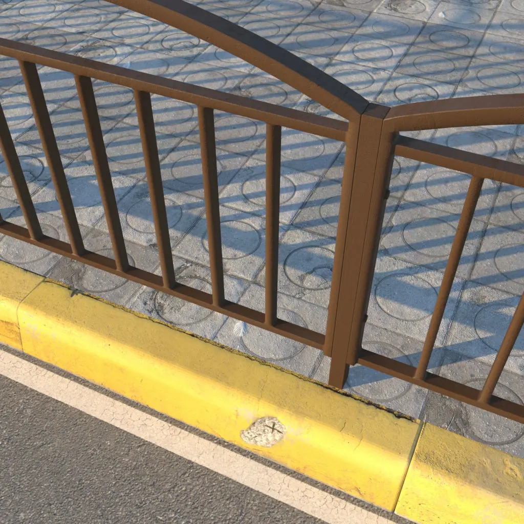 Roadway with a pedestrian crossing and sidewalk. The road is made in the form of puzzles (pleins), a pedestrian crossing with a separate texture lies on top. Borders are modeled and have 12 unique textures + unwrap. 5 types of tactile tile textures are made by a plein. The pedestrian zone is made with a plein, the decal of the “taxi” lies on top of it Fence - Model with unwrap