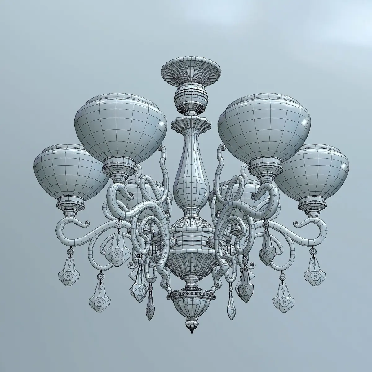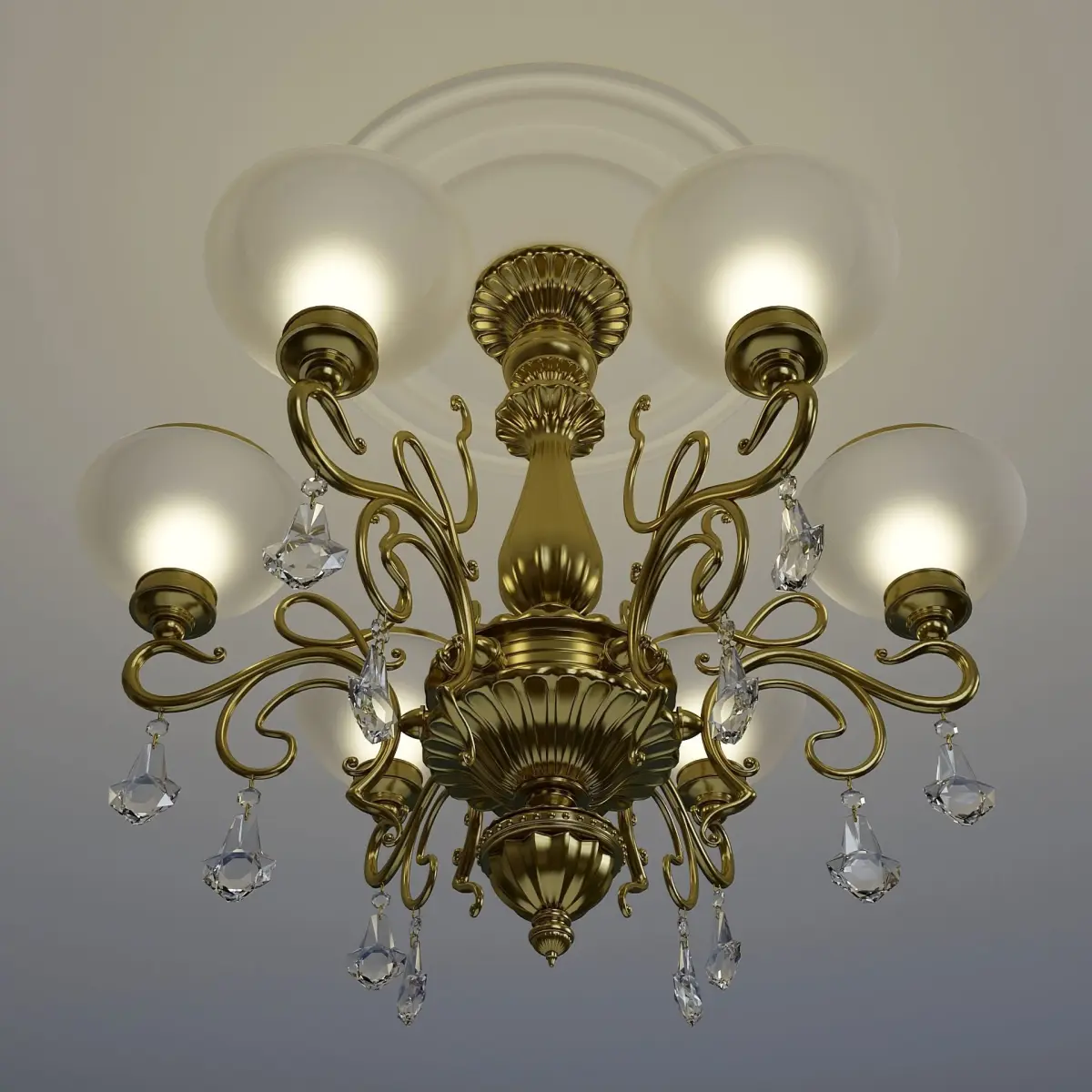 Brass chandelier for six candles with frosted shades. The ceiling lamps of the model are a separate mesh and they can be replaced with others. Crystal pendants are also made with a separate mesh. They can also be replaced or removed. All individual objects are linked to the main bar.