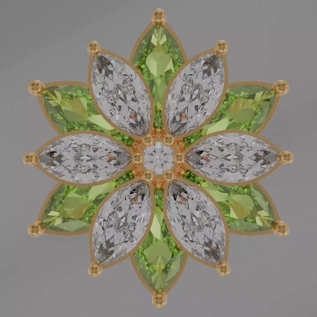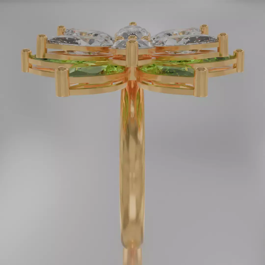 Each ring is crafted with marquise-cut stones arranged in a floral pattern, accented by a sparkling diamond center. High-quality modeling and rendering ensure realistic presentation and strong visual impact.