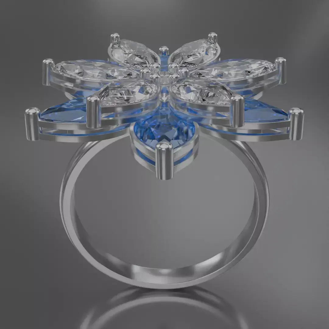 This exquisite flower-shaped ring in silver is designed for those who appreciate harmony, elegance, and modern style. The design is based on six petals, each adorned with marquise-cut gemstones in a rich blue shade. They shine beautifully alongside clear diamonds, creating a striking play of light and highlighting the natural beauty of the floral motif. At the center of the composition lies a small round diamond, adding brilliance and a sense of completeness.