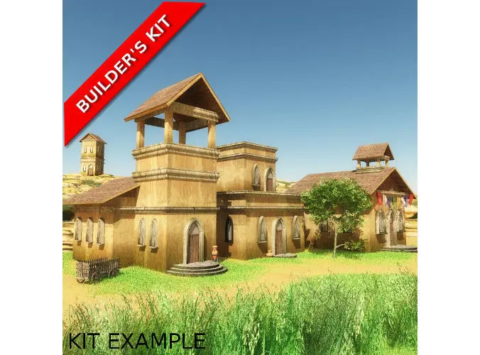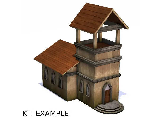 Six Piece Medieval Village Construction Kit includes Gothic pointed arch door and window, accessorized with circular staircase, crown moulding and versatile cubes. Pieces assemble quickly to create unique Medieval dwellings for a low-poly 3D village.