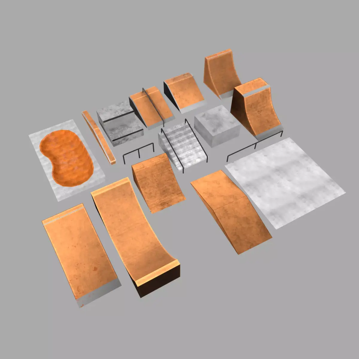 "A modular skate park set with ramps, rails, and platforms. Great for modern urban or youth-focused