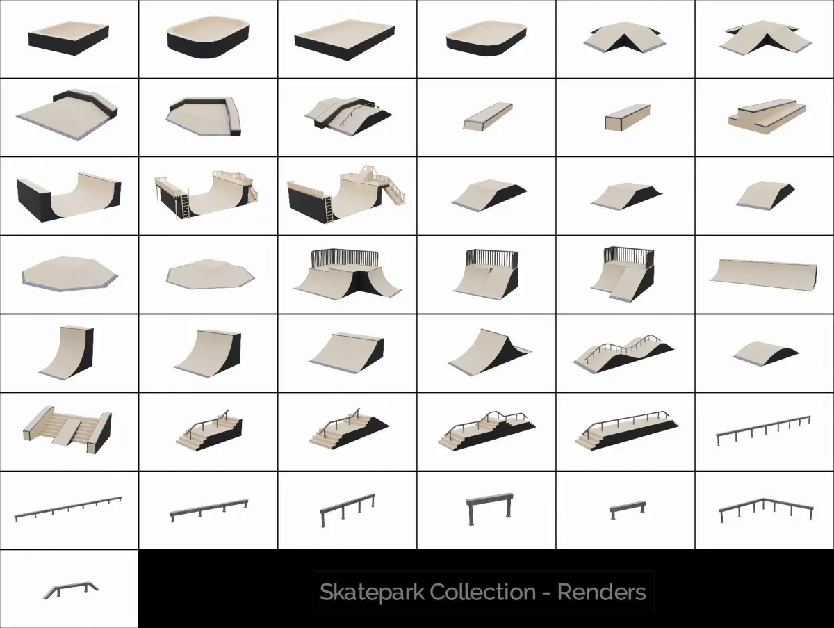Skatepark 3D model collection made using Blender. This collection includes a variety of different ramps, grinds, quarter pipes and more.