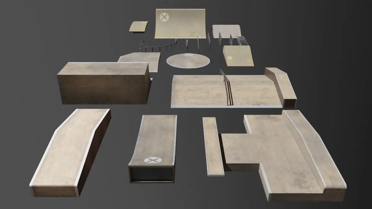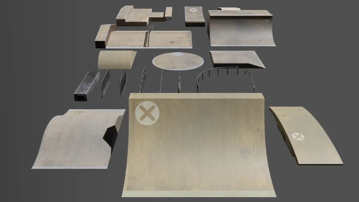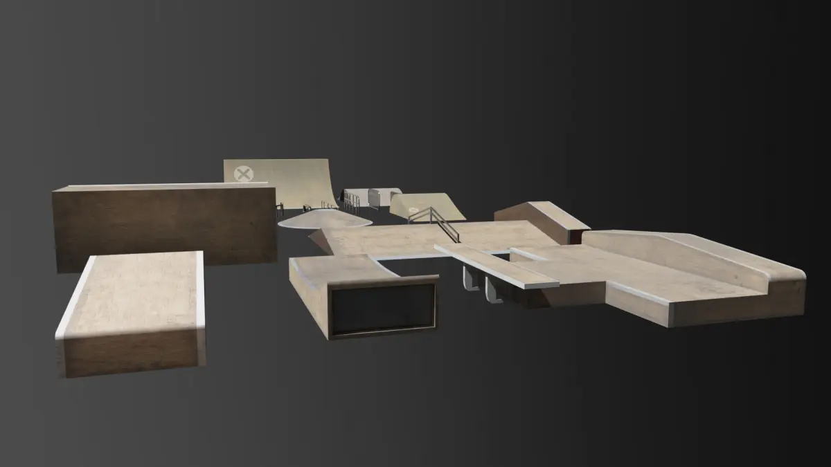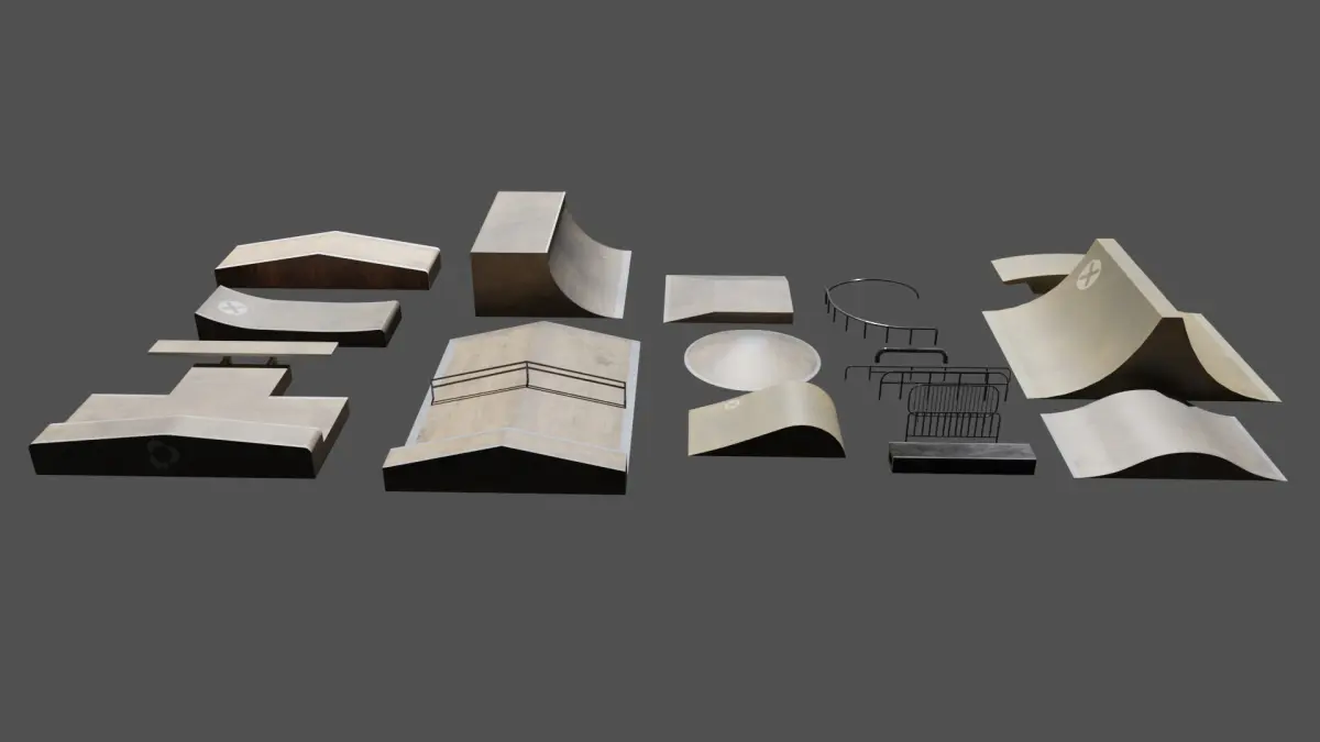 Low-Poly 3D Model of Skatepark SK8 Skate BMX Rail Railing Ramp Trampolines.