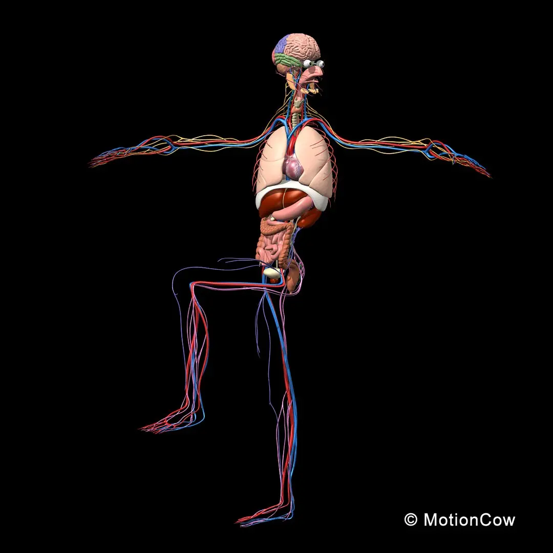 9. The Cardiovascular system is color coded blue & red to distinguish between vein & artery. Heart pumping is achieved by animating a single Heart Bone.
