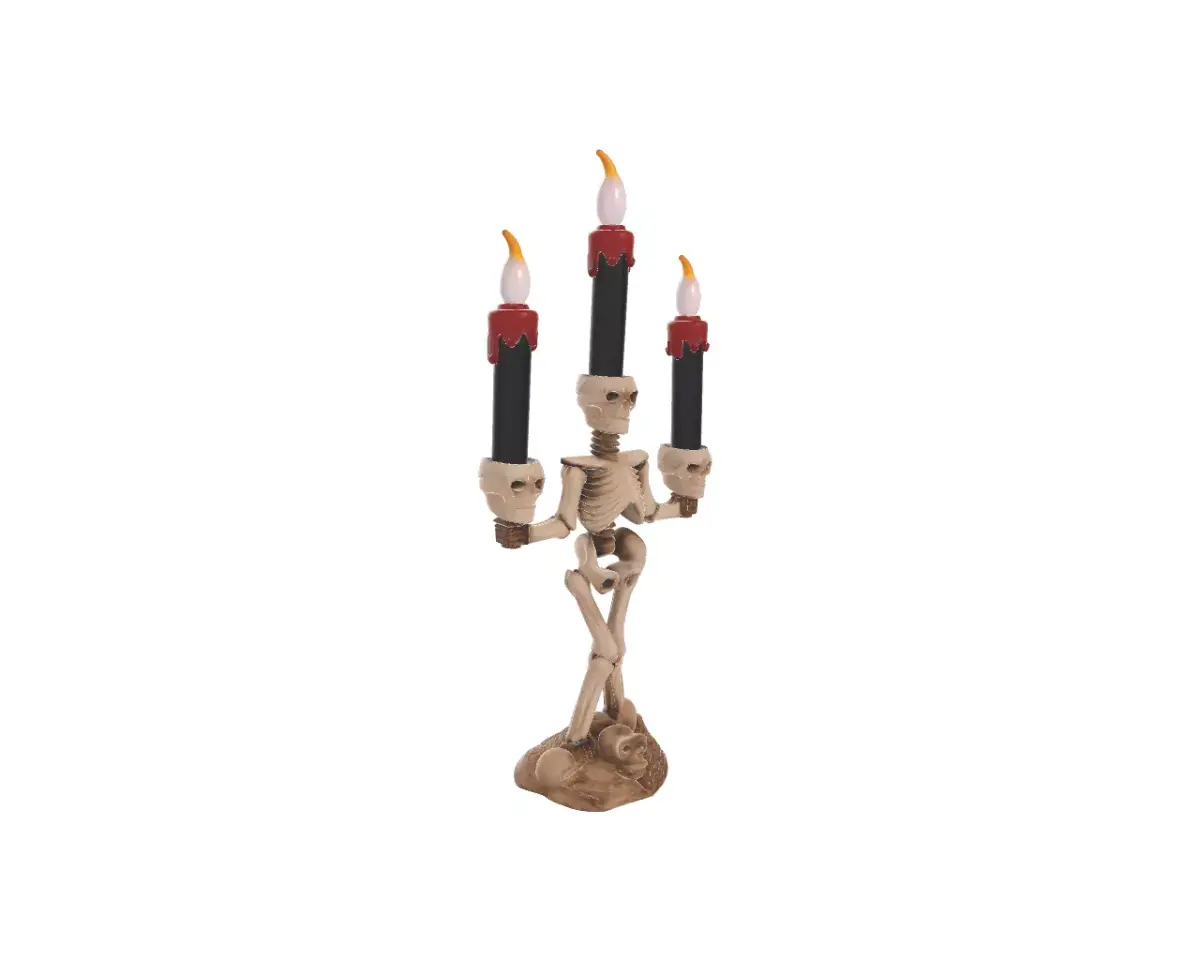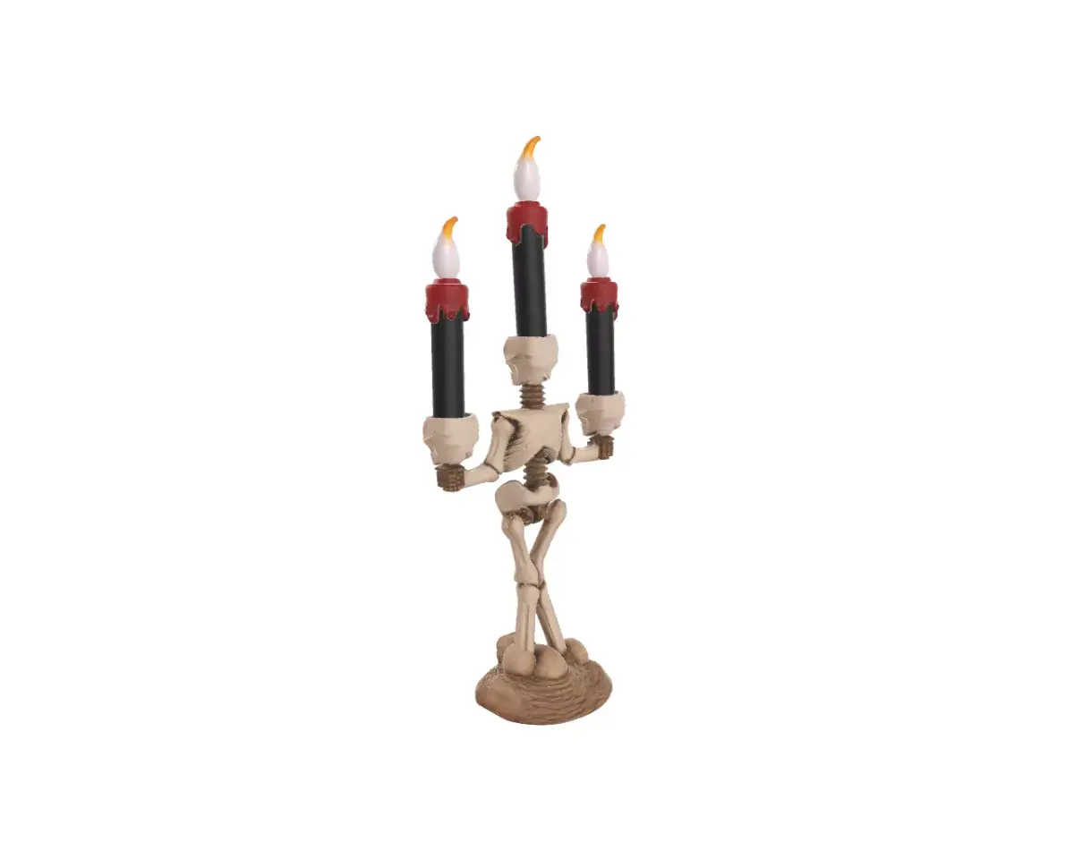 Bring a spine-chilling twist to your Halloween decor with this unique Skeleton Candle Holder! Designed with intricate bone details and a playful pose, this spooky skeleton holds three eerie candles topped with faux flames, perfect for setting a haunted ambiance. The arms are shaped like skulls gripping dark gothic candles with red wax drips, adding a macabre touch to your Halloween table, mantelpiece, or spooky centerpiece.