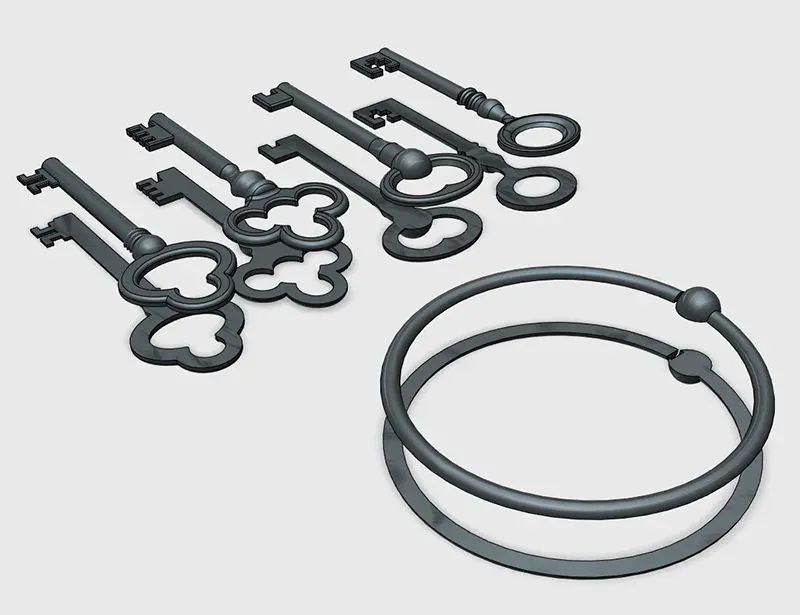 A nice set of some old skeleton keys and ring. there are 2 versions of the models , solid models and split models.I printed these in pla and added texture using a little wood filler. painted them in a couple different finishes. Enjoy