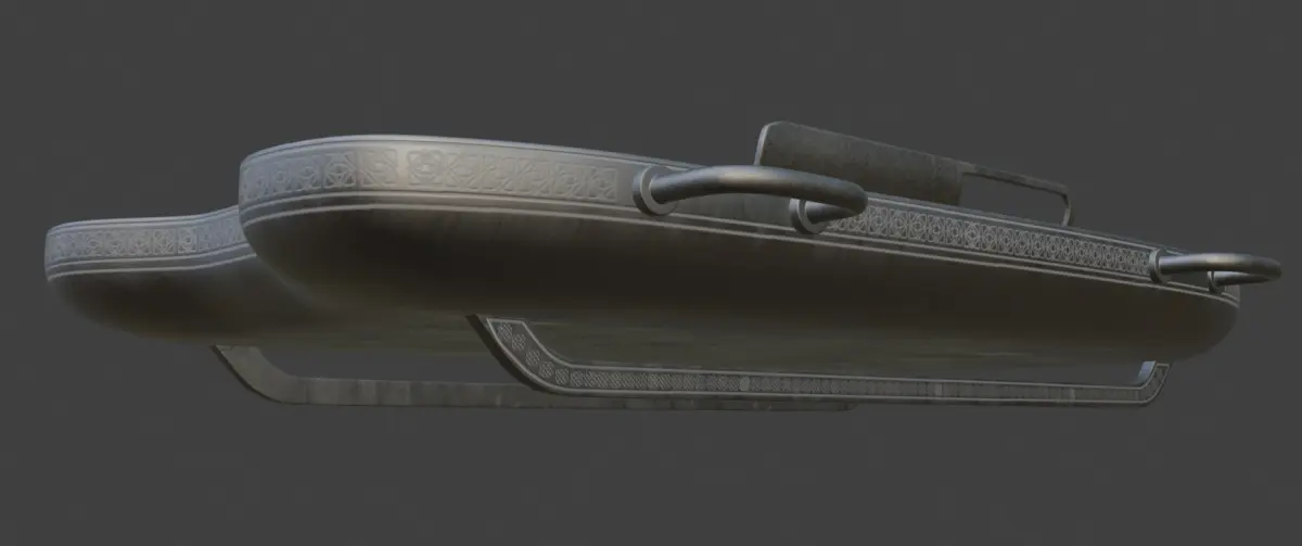 An antique skeleton sled with a wooden frame painted in frosty white, adorned with delicate silver trimmings reminiscent of snow-covered branches, ideal for thrilling rides down snowy hills during the historical era.