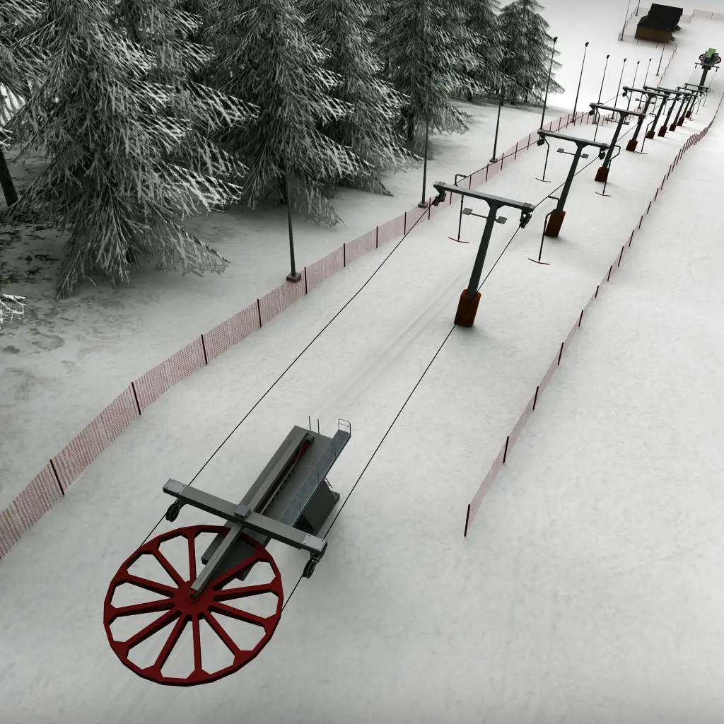 - mountains with trees - ski lift rod - ski lift poles - ski lift machine upper - ski lift machine lower - wooden houses - lights