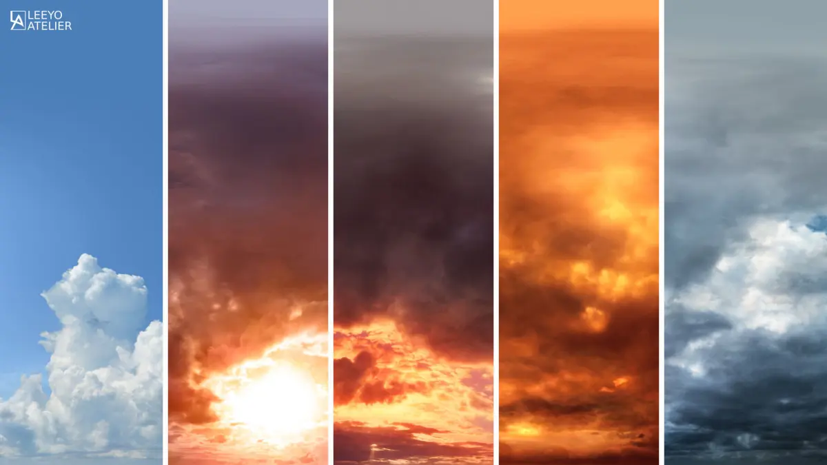 5 Skies - Matte painting textures. Seamless 360 degree panoramas for equirectangular projection (spherical).Resolution: 8192x4096 pixels.Quality: sRGB 16bit.3D Meshes: sphere and hemisphere.