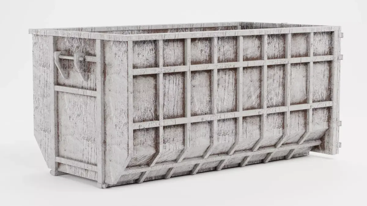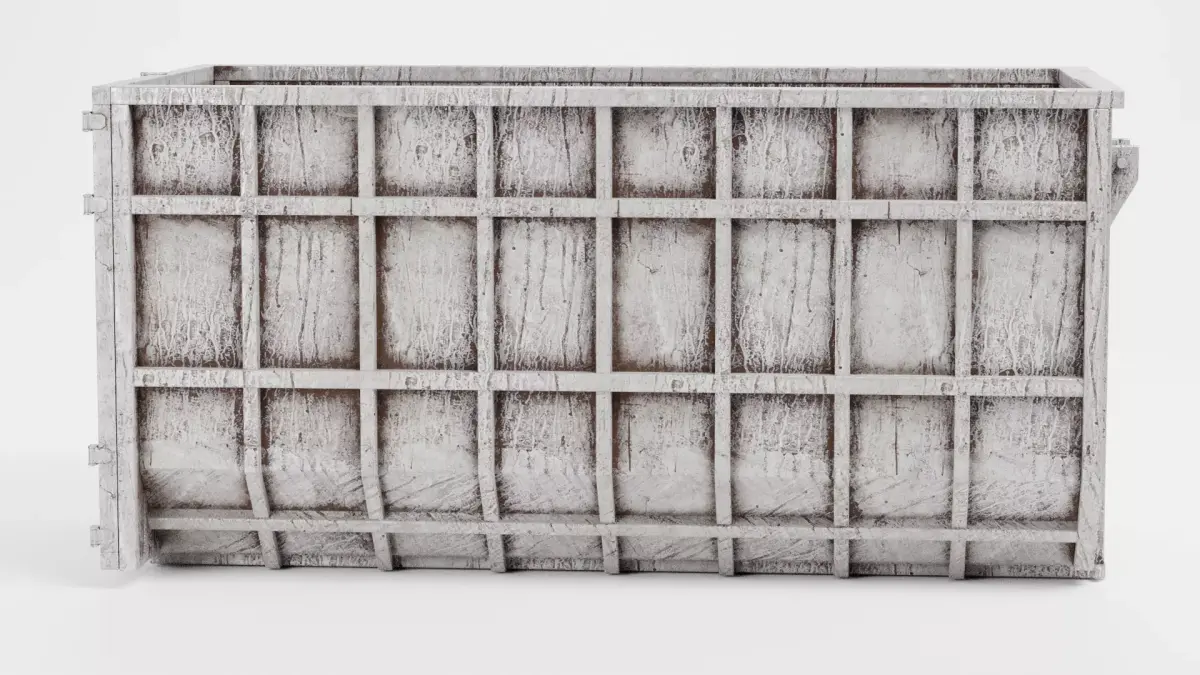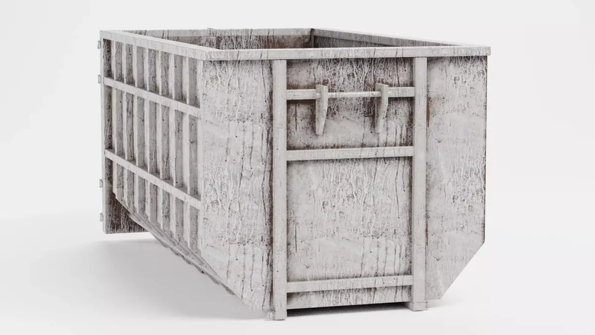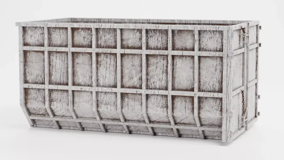 A robust industrial waste bin designed with a focus on structural durability and heavy weathering. The model features a reinforced metal frame that displays significant field-tested characteristics, including oxidized paint, grime buildup, and surface abrasions. The interior floor is treated with gritty textures and darkened residues, reflecting its history of transporting heavy debris. This asset is perfect for urban demolition or active construction site visualizations.