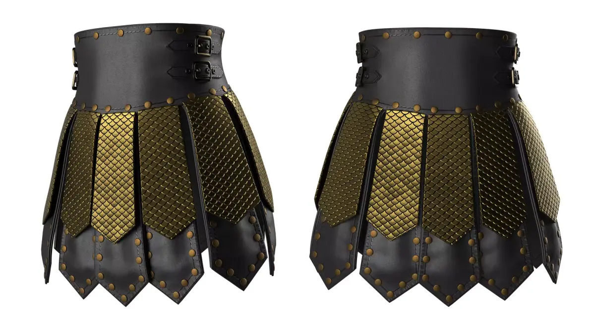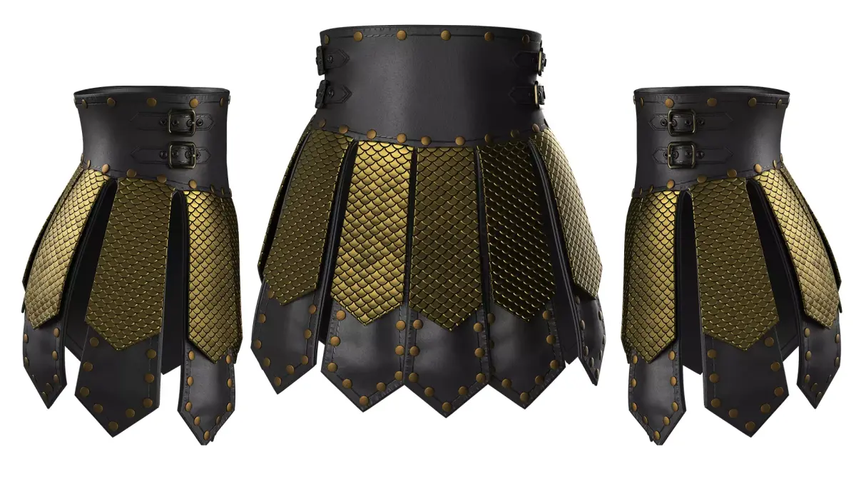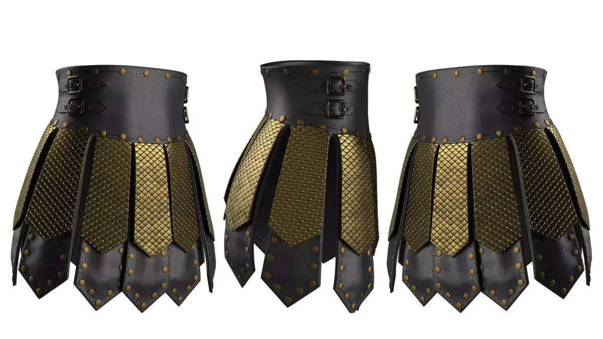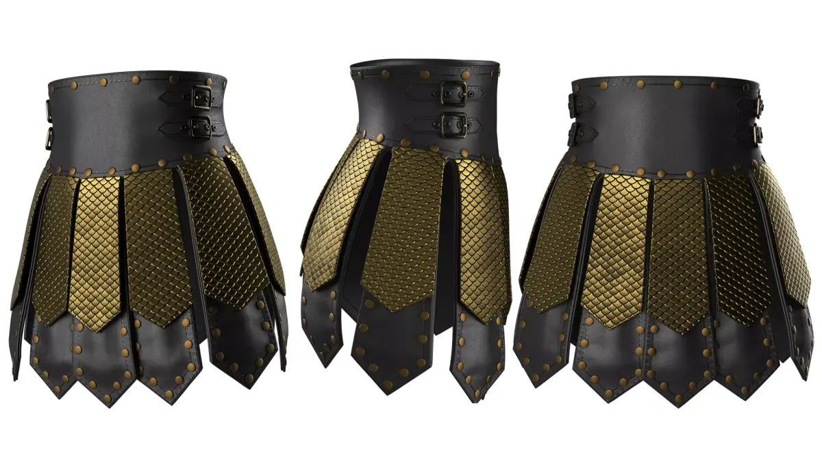 A Viking-style Skirt Armor crafted for fierce shieldmaidens and Norse warriors. Ideal for historical, fantasy, or game characters. This 3D model features rugged leather textures, metal detailing, and a battle-worn aesthetic, making it perfect for RPGs, animations, and cinematic projects.