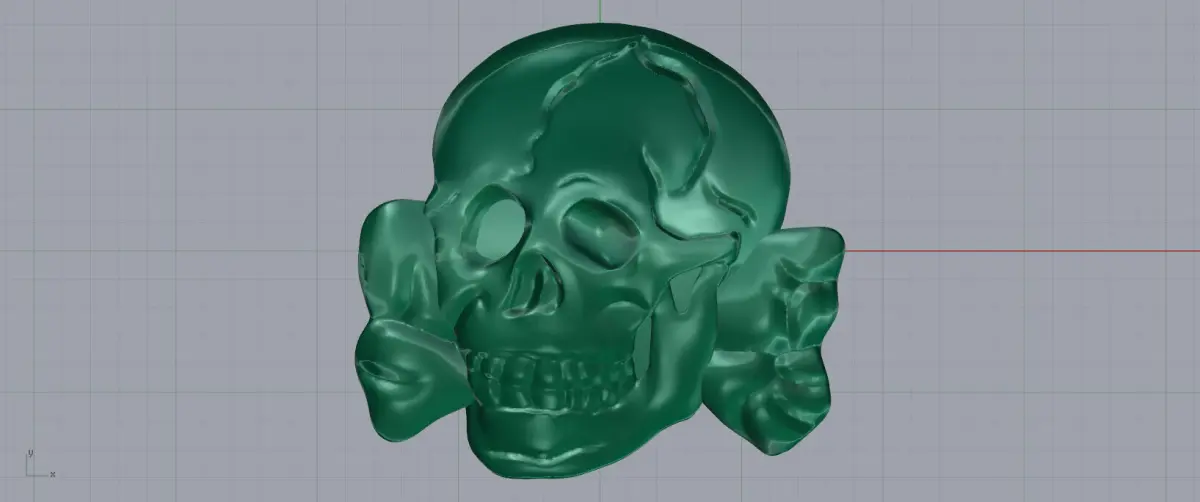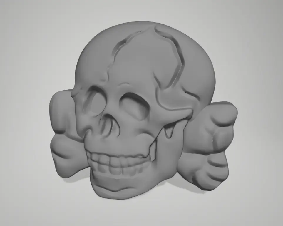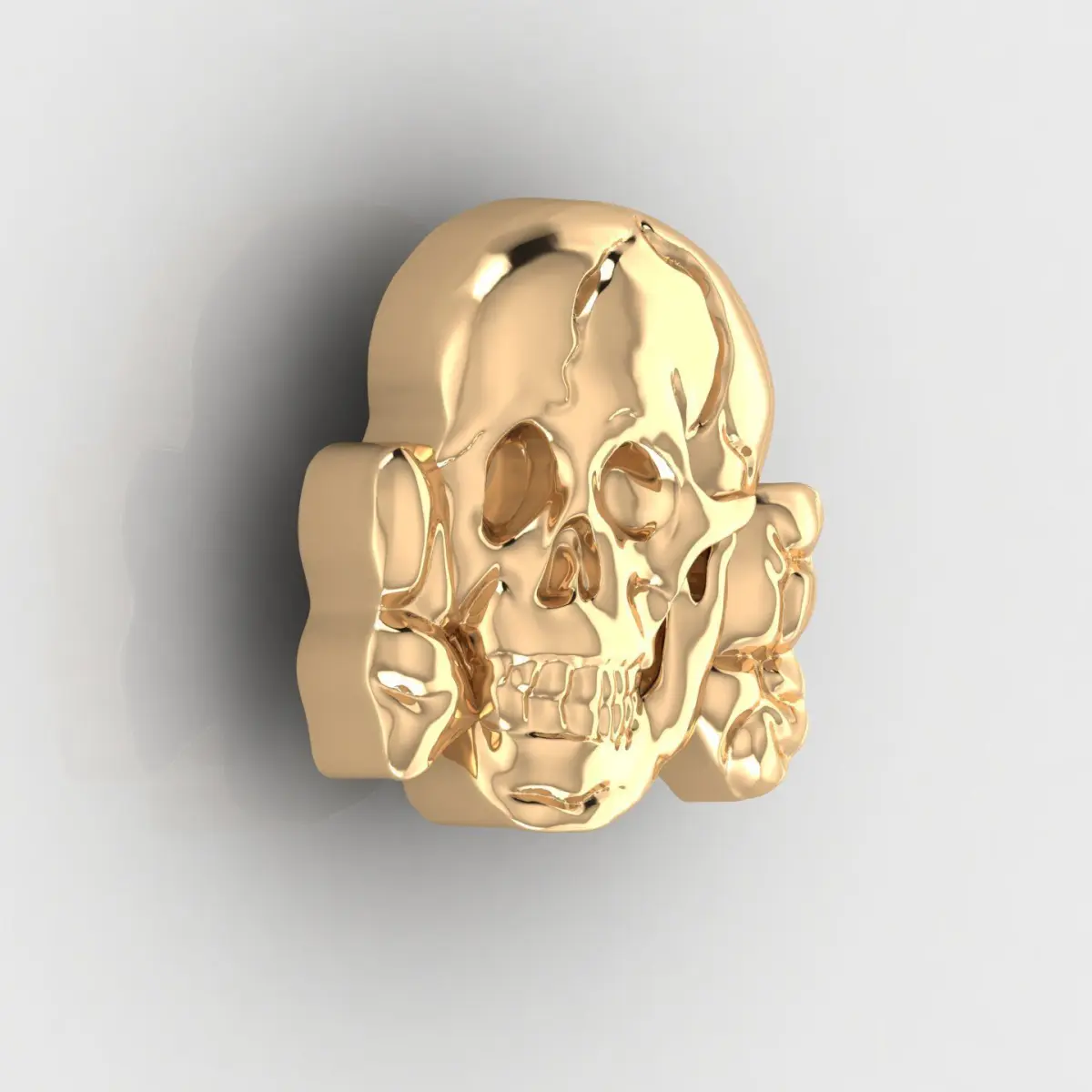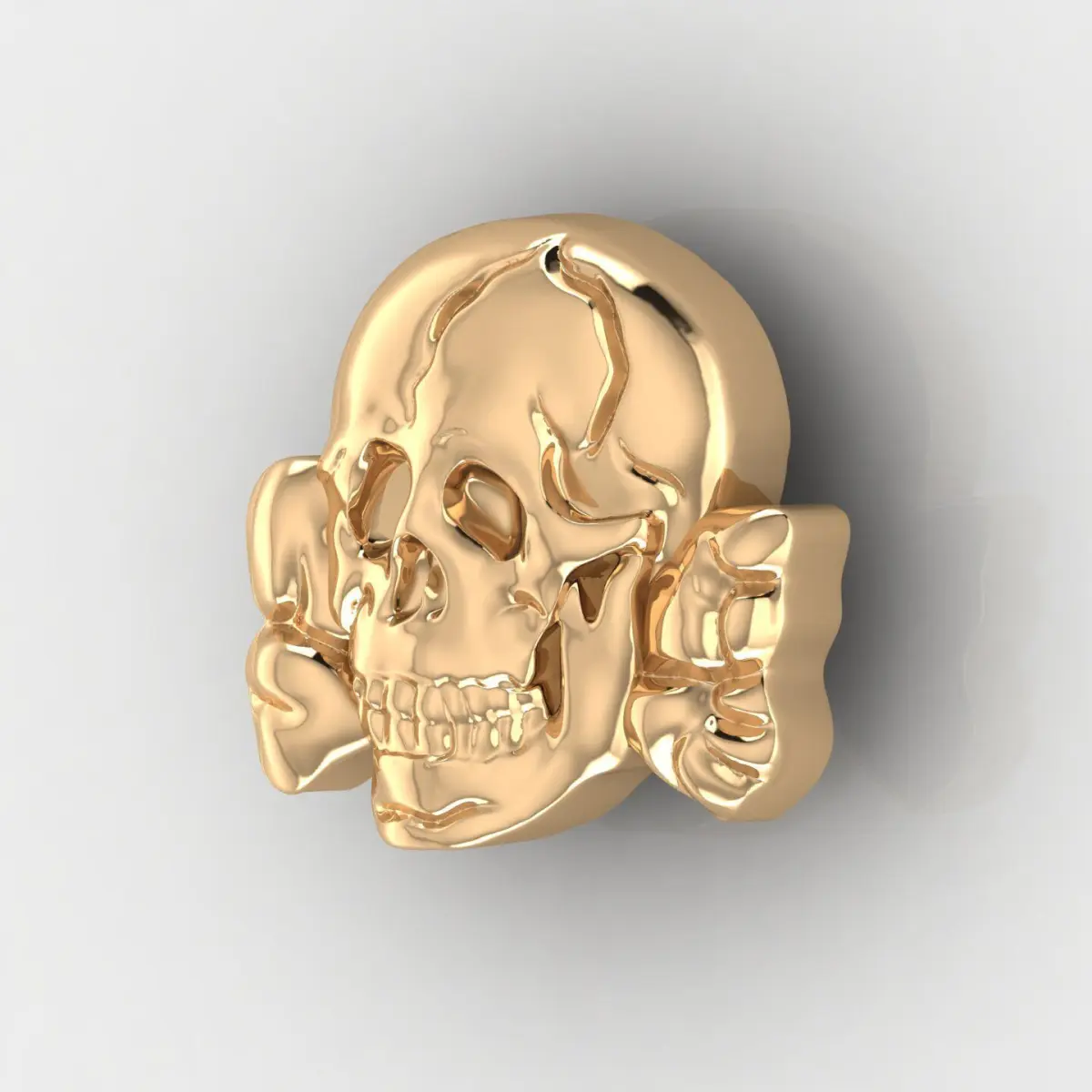 A polished gold skull with uniquely twisted bones on each side, giving the piece a bold and symbolic appearance. The sculpted details emphasize anatomical precision and artistic flair, blending gothic and surreal elements. Perfect as a pendant or statement accessory in a collection inspired by anatomy or dark aesthetics.