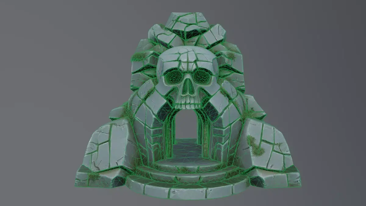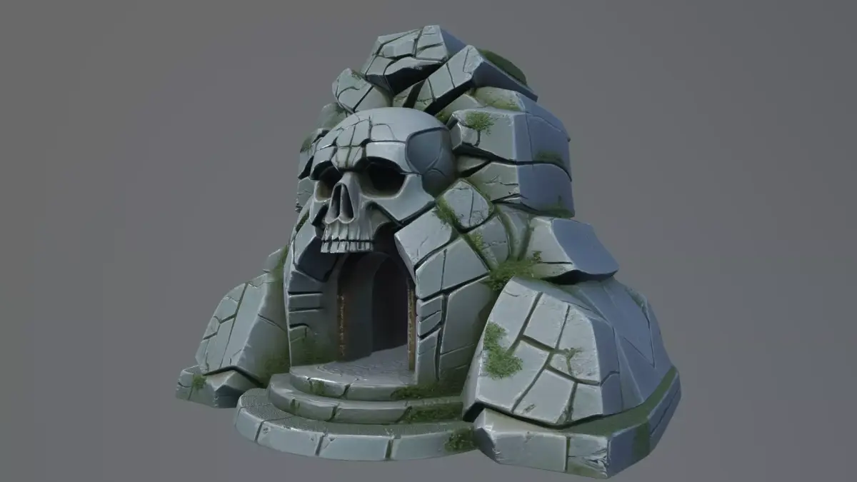 this Skull Cave Entrance is designed to act as a primary landmark or transition point for your levels. The model showcases a low-poly but high-detail aesthetic, with sharp rock formations, weathered stone cracks, and integrated green moss patches that suggest an ancient, overgrown origin. This asset is game-ready and professionally optimized for performance, provided in blend, fbx, and obj