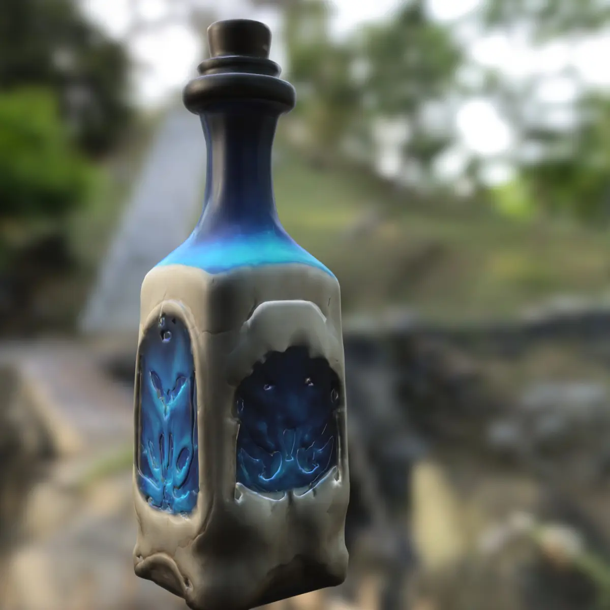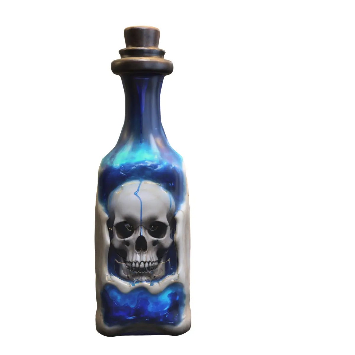 A sinister 3D model of a dark potion bottle featuring a realistic skull embedded in glowing blue liquid. This asset is designed for use in horror, necromancy, or magic-focused games such as Diablo IV, Dark Souls, Elden Ring, The Witcher, or Skyrim. Perfect for inventory systems, alchemy crafting, or environment props. This model is provided in OBJ, FBX, STL, DAE, PLY, and GLB formats, making it fully compatible with engines like Unreal Engine, Unity, and tools like Blender. Also optimized for 3D printing to bring your dark fantasy world into the physical realm.