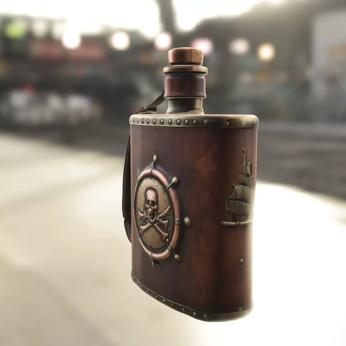 Detailed 3D model of a pirate-themed flask featuring a skull and crossbones emblem within a ship’s wheel. Ideal as a potion container, collectible item, or decorative prop in pirate, medieval, or fantasy games. Can be used in popular titles such as Sea of Thieves, Assassin’s Creed IV: Black Flag, Skyrim, and The Witcher 3. Fully compatible with Unity, Unreal Engine, and Godot for seamless integration. Provided in multiple formats: OBJ, FBX, STL, DAE, PLY, GLB, and Blender. This model is also optimized for 3D printing, making it perfect for collectors, tabletop RPGs, or cosplay accessories.