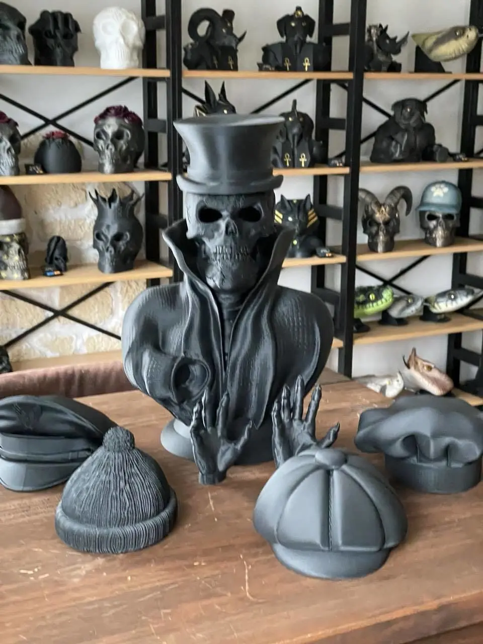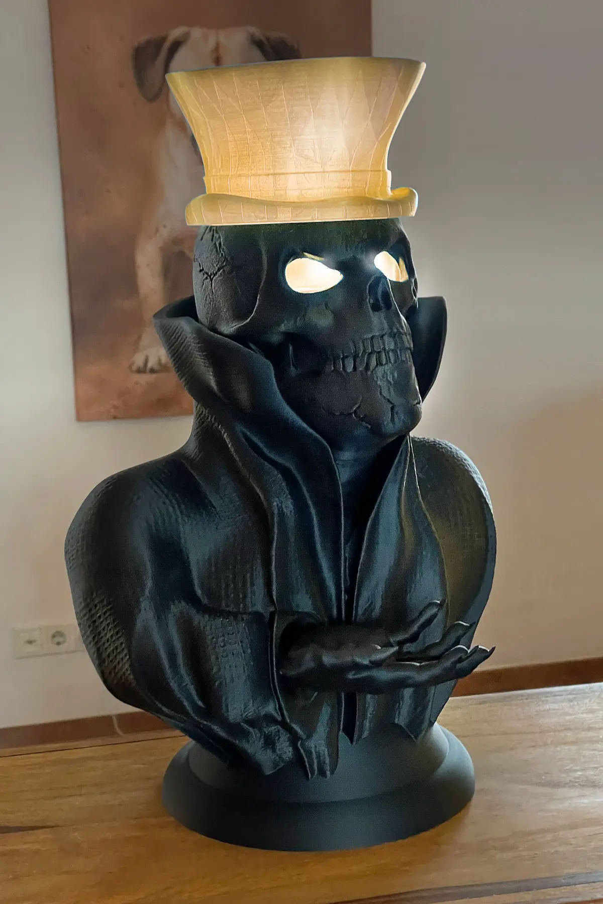The overall printable model consists of 5 STL files and can be printed in parts:Cape-Skull-Collar-Lamp-V1-BODY.stlCape-Skull-Collar-Lamp-V1-Hand.stlCape-Skull-Collar-Lamp-V1-Head.stlCape-Skull-Collar-Lamp-V1-Plate.stlHeadgear-ZylinderHat.stl