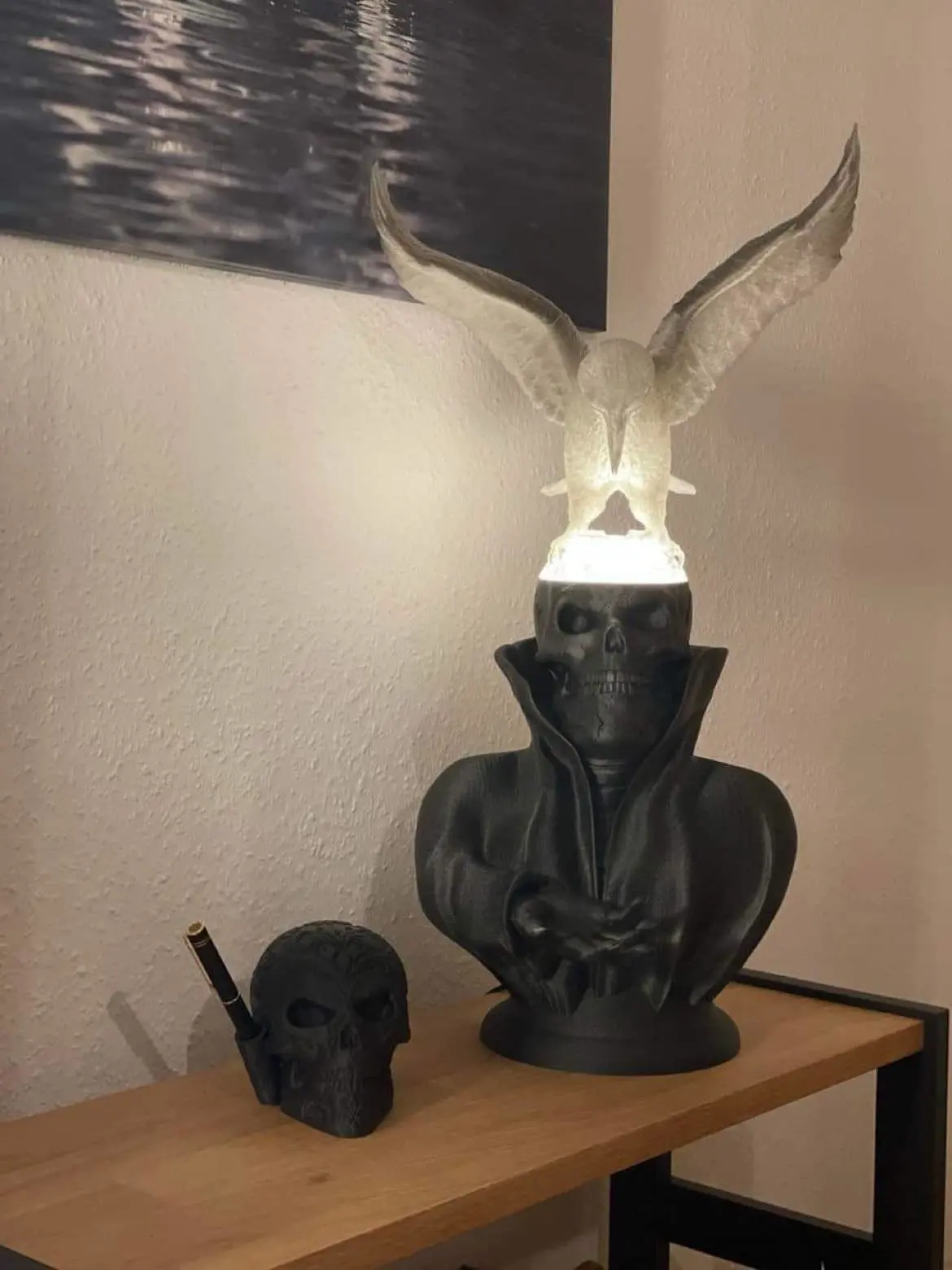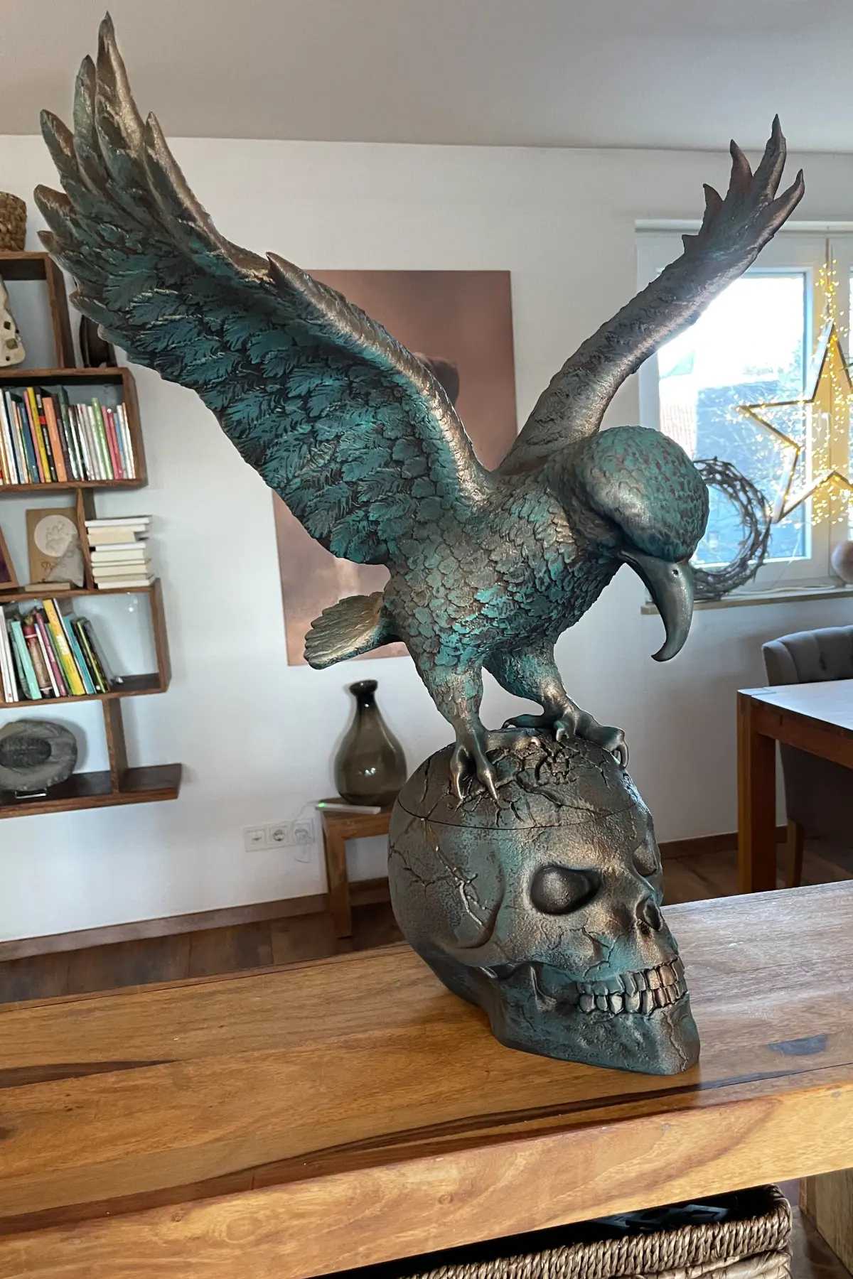 Skull lamp with eagle, open eyesOpen eyes, bird removableCut (large format)The hand comes in 3 sizesAlso usable solely as a storage space3D model fileHigh-polygon