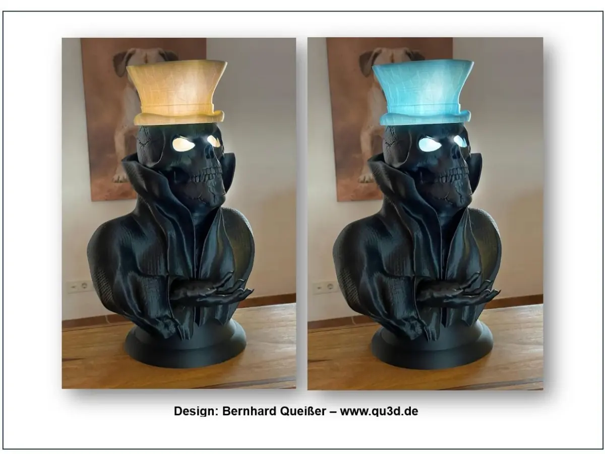 Print this unique light fixture or storage unit for yourself. The CAPE-Skull figure can be easily produced by printing it in parts. A cable duct runs through the inside of the figure, starting from the hollow skull. The lid/headgear is removable.