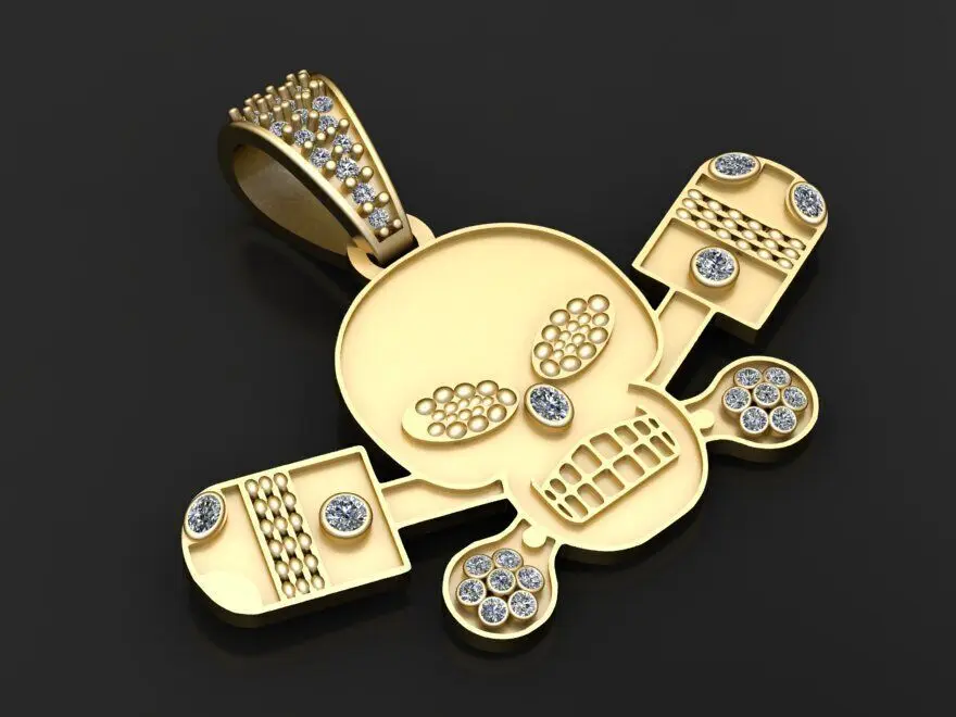 This edgy and artistic 3D pendant design presents a bold reinterpretation of the classic skull-and-crossbones motif. Crafted in rich gold, the skull is accentuated with diamond-studded eyes and teeth, while stylized pistons replace traditional crossbones—each detailed with intricate beading and brilliant-cut stones. The bail is also embellished with a cluster of diamonds, enhancing the overall luxury. A perfect blend of rebellion and refinement, this pendant is ideal for bikers, rockers, or anyone with a fearless sense of style.