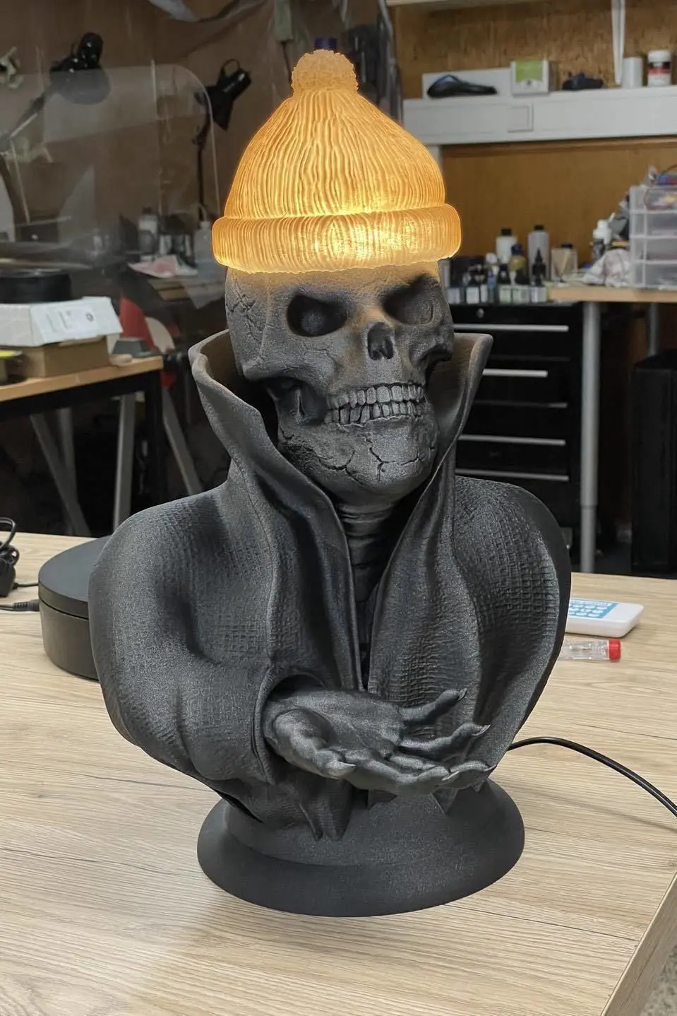 With the Skulls with closed eyes, you can print the headgear with transparent filament and then get a nice, subtle light. All models are easily divisible, and the series has been printed by us to ensure that everything is functional. For each of these lamps, there is the possibility to purchase different headgear.
