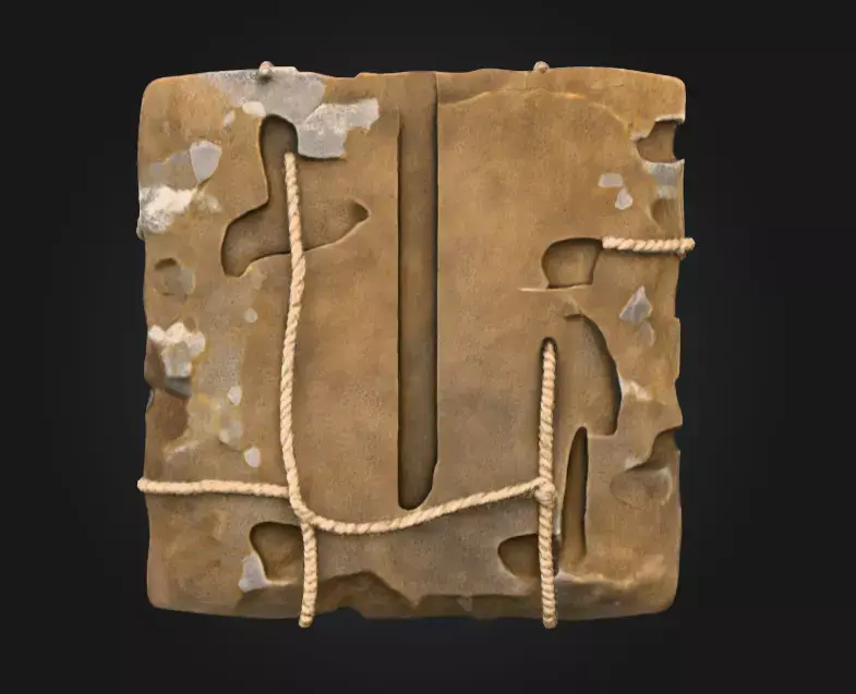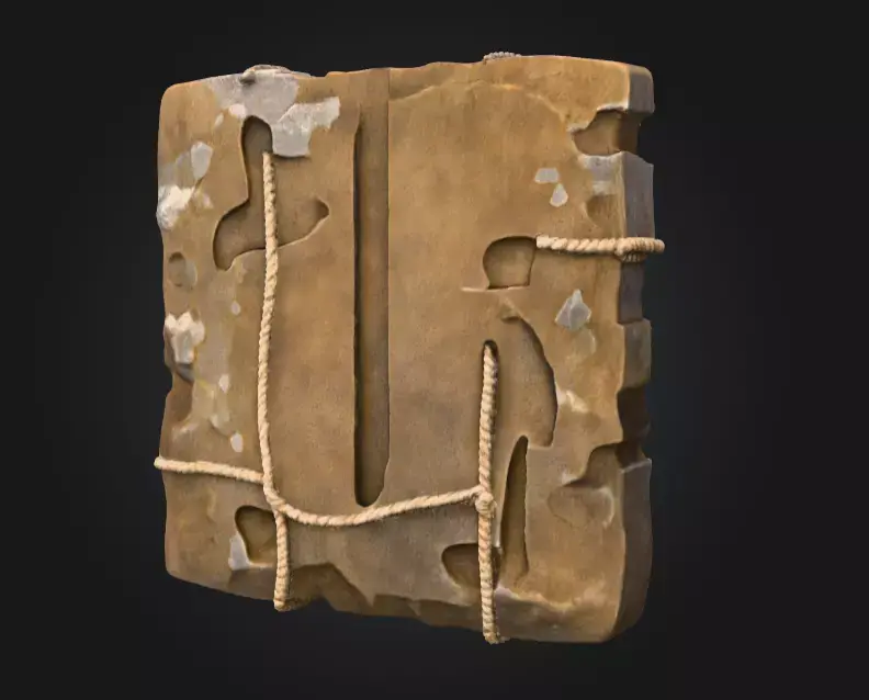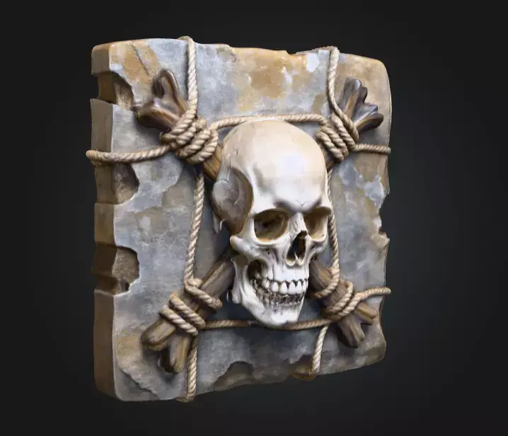 The Skullbound Relic Tablet is a hauntingly detailed 3D model that captures the essence of ancient curses and forgotten civilizations. This sculptural piece presents a weathered stone slab meticulously carved and aged, bearing the dramatic centerpiece of a human skull fastened by intertwined ropes and crossed wooden stakes. Every surface tells a story—the eroded edges of the stone evoke the passing of countless centuries, while the realistic texture of the rope suggests a timeless struggle, as if holding back an ancient secret or dark power. The skull itself is masterfully rendered with lifelike anatomical precision, combining subtle bone shading with shadowed cavities that give it a menacing presence.