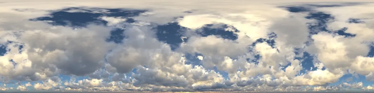 Equirectangular 32-Bit HDR OpenEXR files of a cloudy overcast afternoon sky, cumulus clouds at 8k resolutions and a tone-mapped PNG File backplate which can be used if you decide to use a lower resolution or blurry version. The HDR will work in any software which is capable of loading equirectangular HDR's.