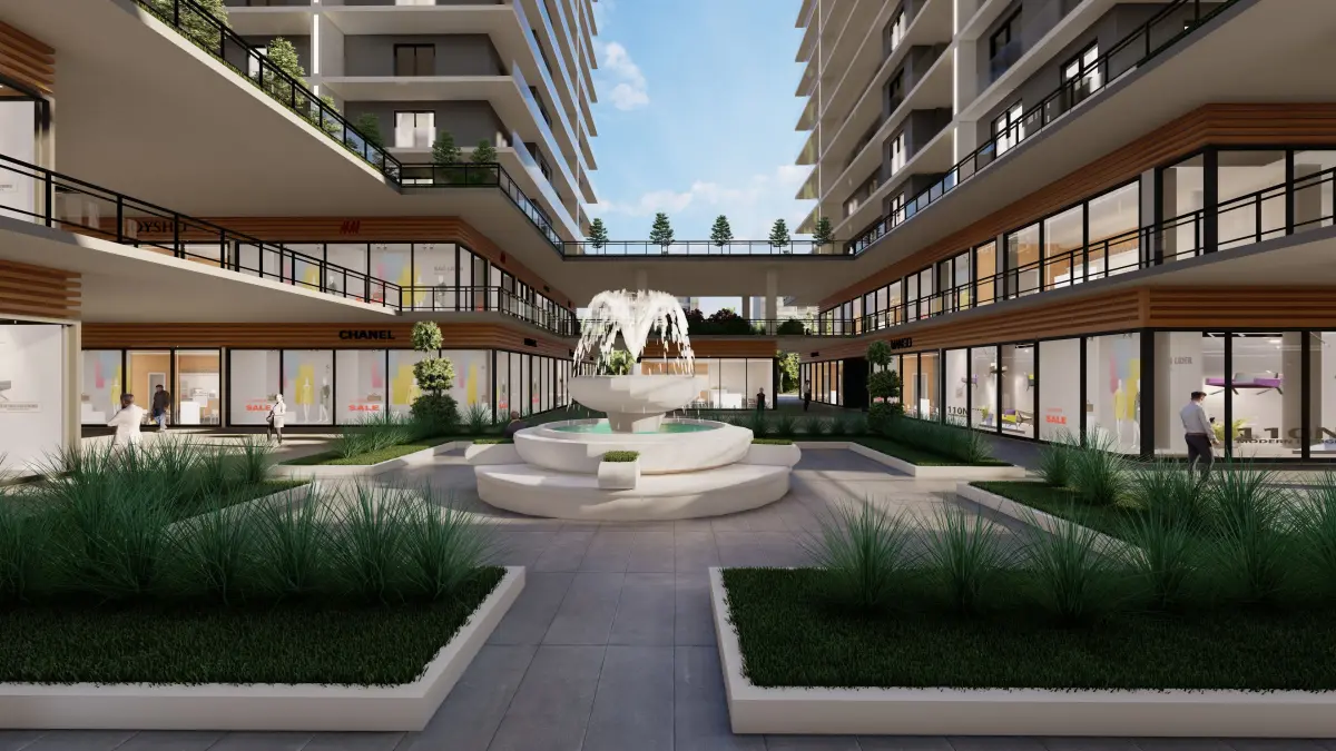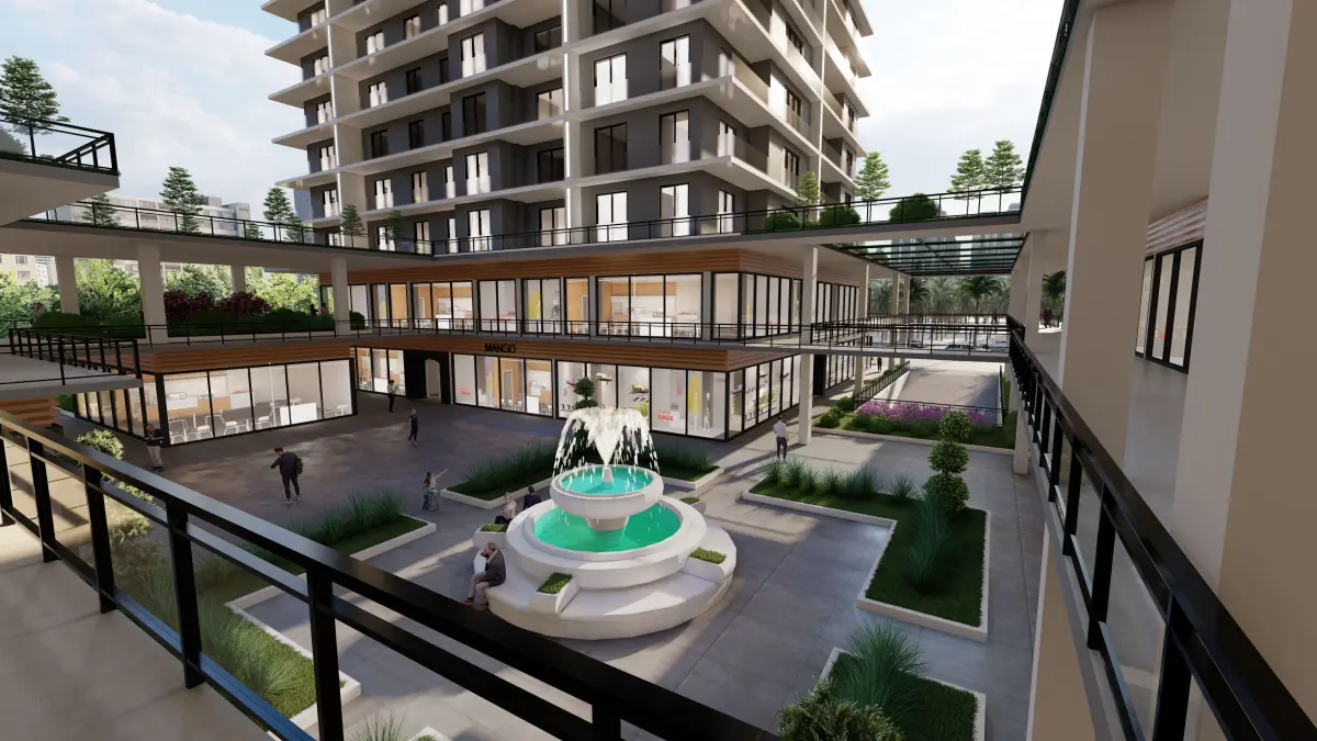 Courtyard design: Includes a landscaped inner courtyard with a decorative water fountain.
