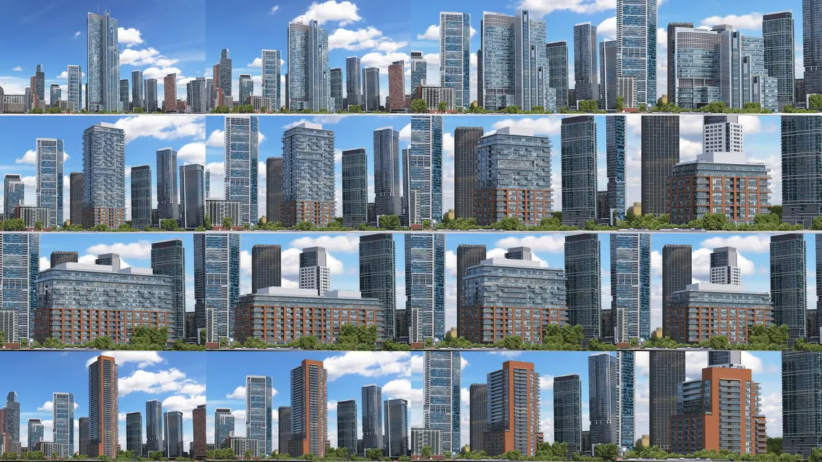 Collection contains unique skyscrapers and apartments from around the world, 'Varso Tower and Rondo 1' from Warsaw', 'Pace_Condominiums', "126_Simcoe_St" from Toronto and some variation of this buildings. Originally created with Autodesk 3ds 2019.