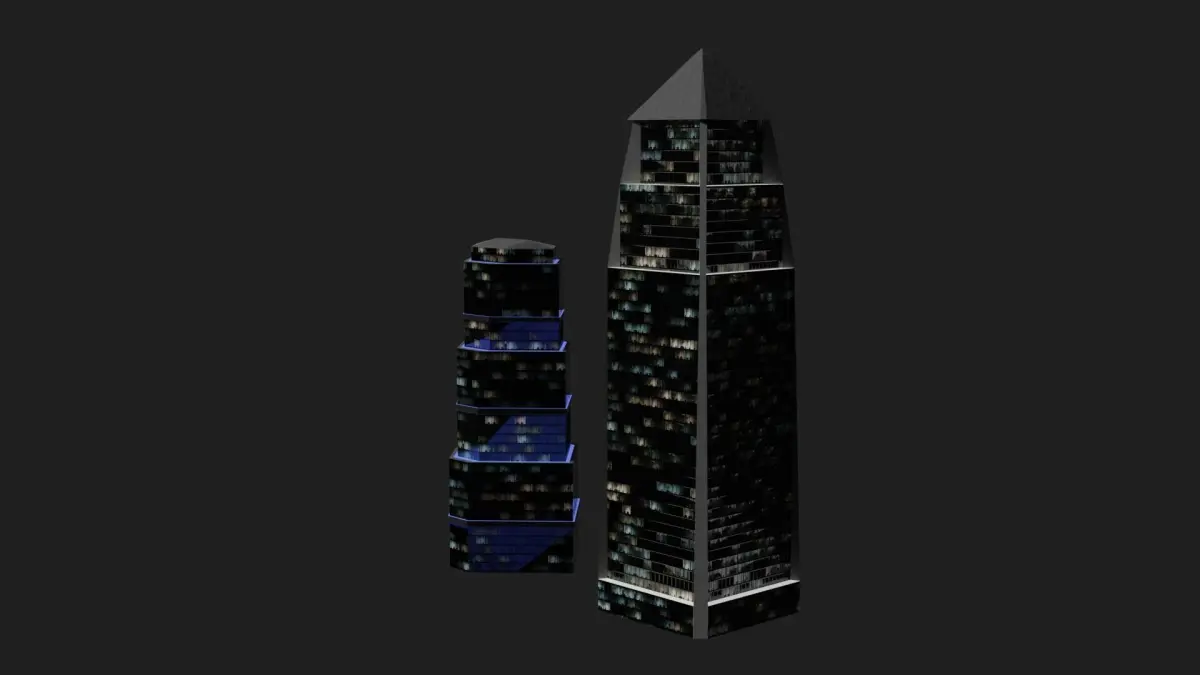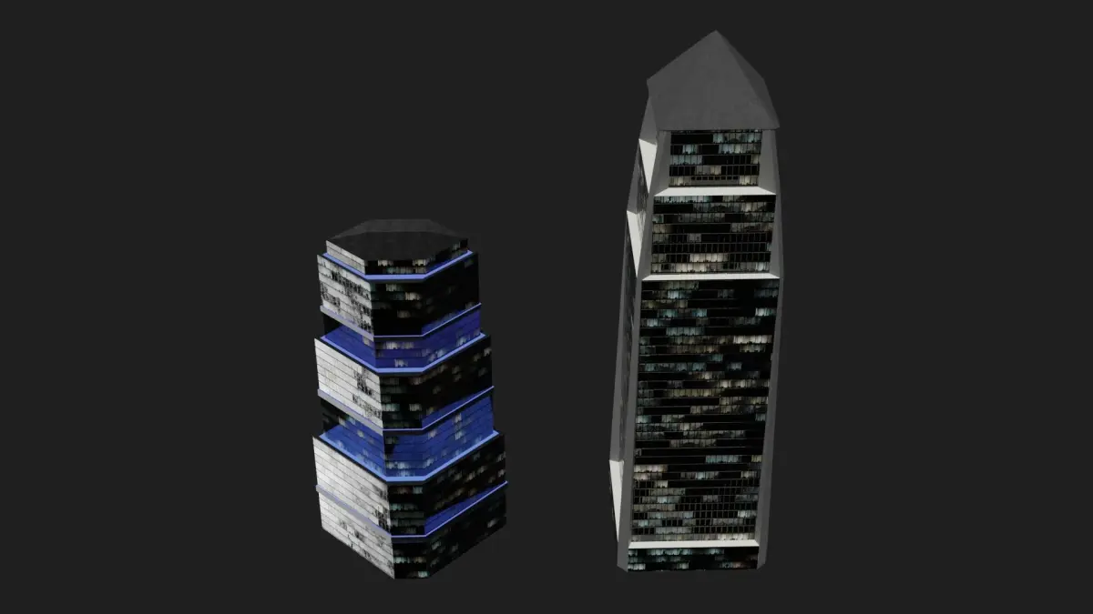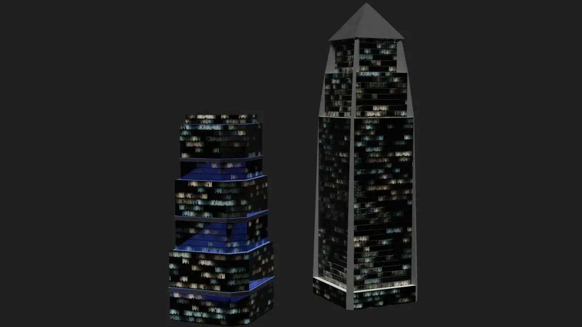 This pack includes 2 skyscrapers. Its modelled and rendered in Blender. Each Skyscraper has 1 uv (non overlapping) map. Textures are 4K. Each UV's have 5 textures (base color, metallic, roughness, normal and emmisive). Textures are prepared in Substance Painter. Also substance painter file is added. You can change textures and also their sizes, too. Have fun :) TOTAL Verts: 85 Poly:105