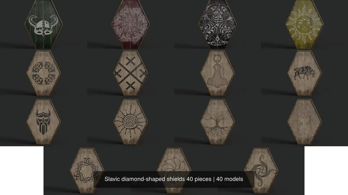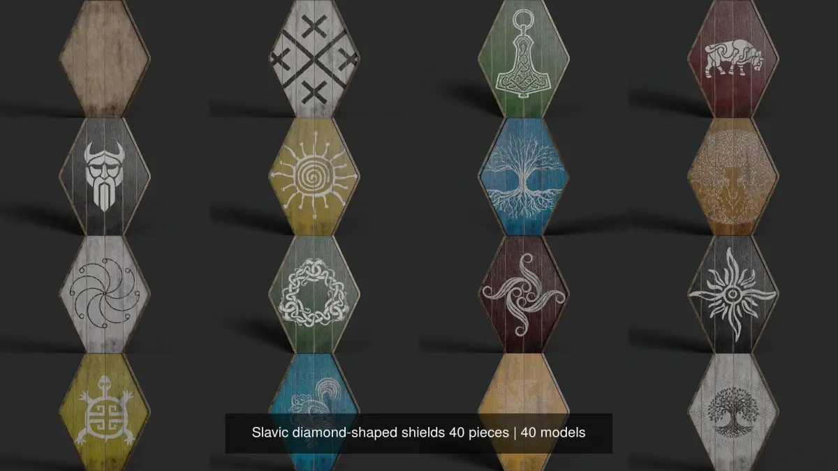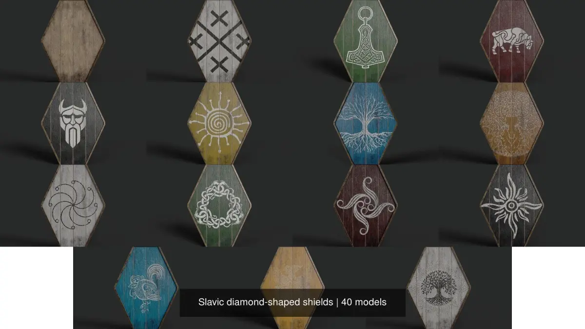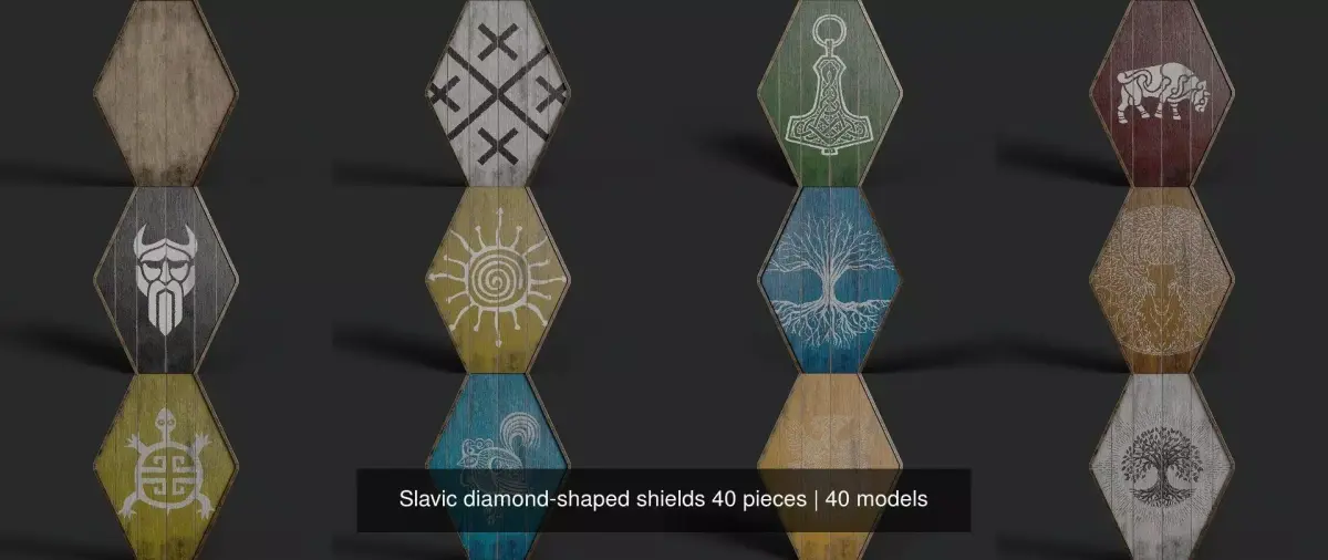 Hello, their! Medieval Viking- East Slavic diamond-shaped shields 40 pieces. Asset is Sculpted in Zbursh / Zbrush details are baked into normal map for better optimization.The model has 4 types of imported texture sets: PBR Metallic Roughness, Unity, UnityHDRP, UnrealEngine (BaseColor, Normal, ORM-occlusion, roughness, metallic). All sets have resolutions of 1024x1024, 2048x2048, 4096x4096.Game ready model.