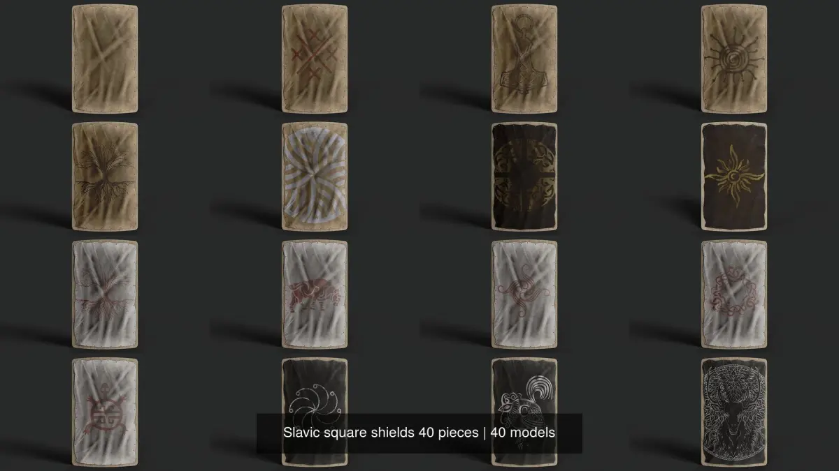 Hello, their! Medieval Viking- East Slavic square shields 40 pieces. Asset is Sculpted in Zbursh / Zbrush details are baked into normal map for better optimization.The model has 4 types of imported texture sets: PBR Metallic Roughness, Unity, UnityHDRP, UnrealEngine (BaseColor, Normal, ORM-occlusion, roughness, metallic). All sets have resolutions of 1024x1024, 2048x2048, 4096x4096.Game ready model.