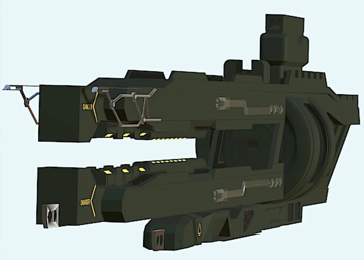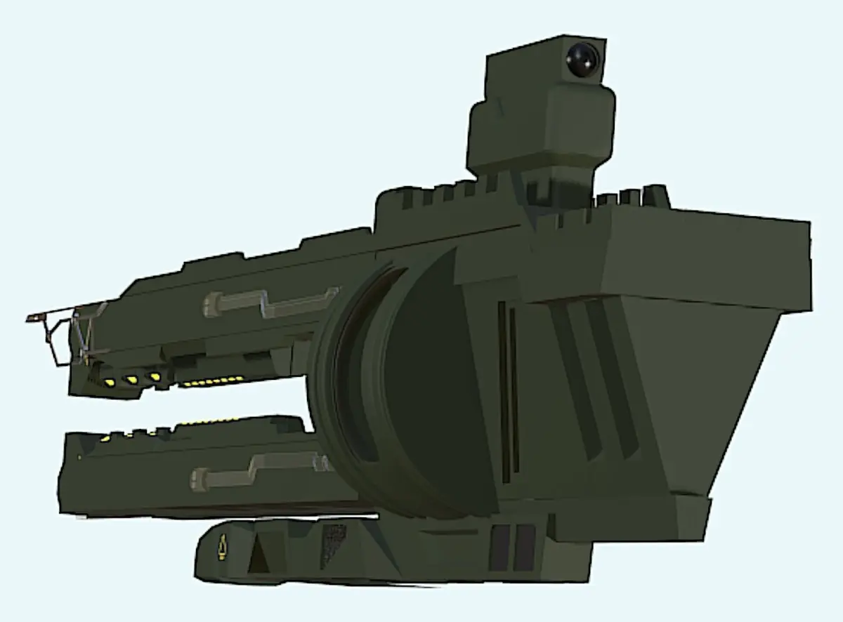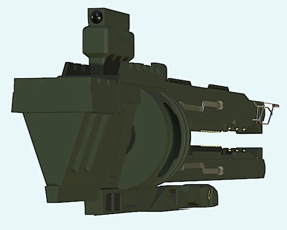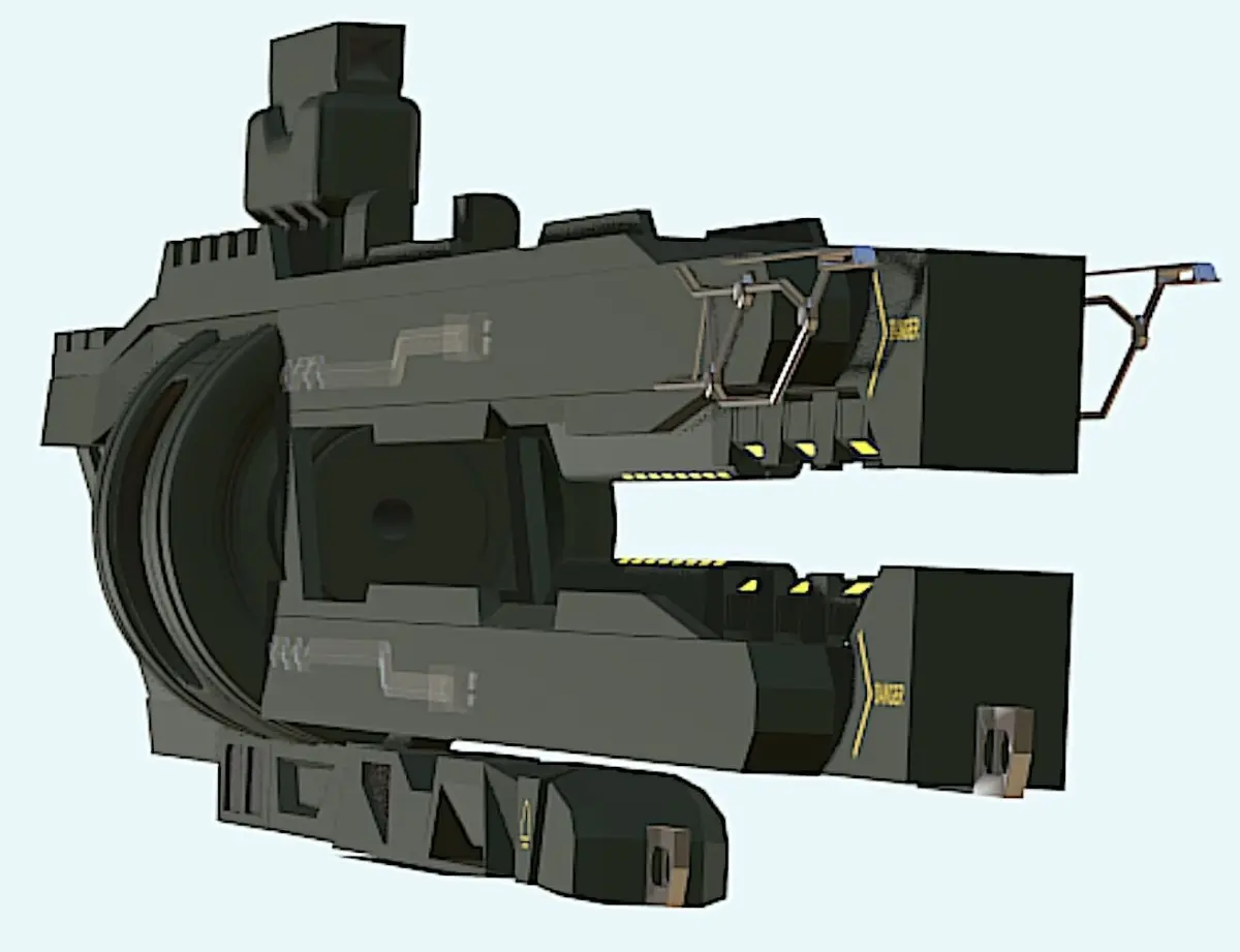 The object in the image is identified as a size 2 mass driver cannon, specifically the Klaus & Werner Sledge II Mass Driver Cannon. It is a ballistic weapon that fires various types of ammunition and is recognized for its significant impact. This cannon uses railgun technology to launch high-damage projectiles accurately over long distances. While effective against shields, its magazine capacity is limited, requiring frequent reloading. It has a reduced power cost and EM signature because it does not use energy-based projectiles.