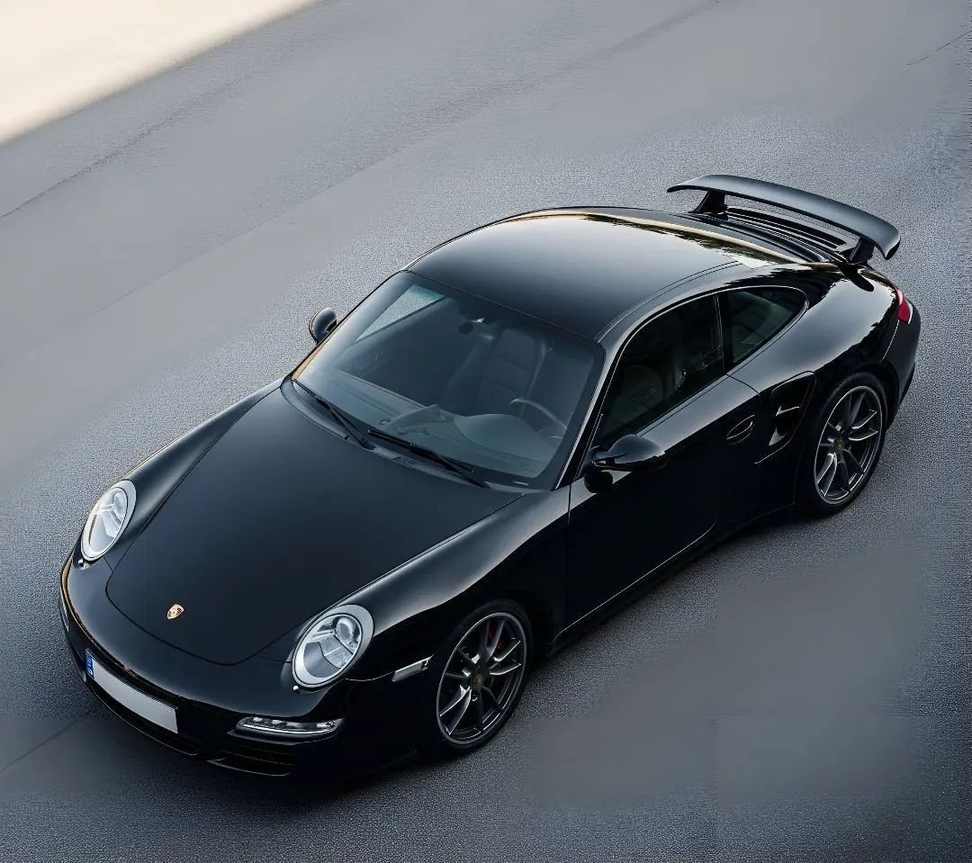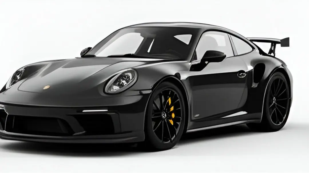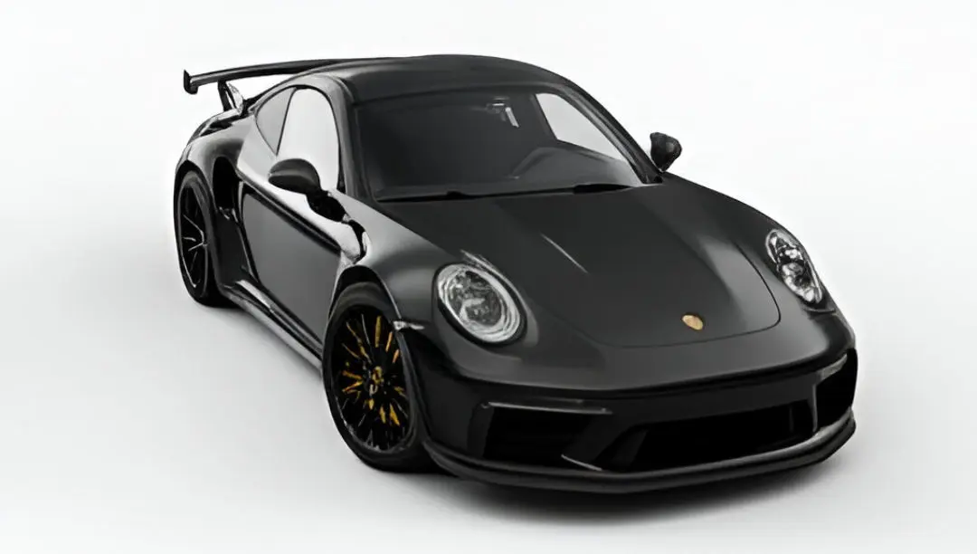 A meticulously detailed 3D model of a modern Porsche 911 GT3, presented in a glossy black finish. This high-performance sports car features its iconic silhouette, a prominent rear wing, center-locking black wheels with high-performance tires, and distinctive headlights and taillights. Yellow brake calipers provide a subtle but striking contrast. The model is rendered against a clean white background, emphasizing its elegant yet aggressive design and aerodynamic features. This model is perfect for automotive visualizations, racing game development, virtual showrooms, or any project requiring a realistic and iconic sports car.
