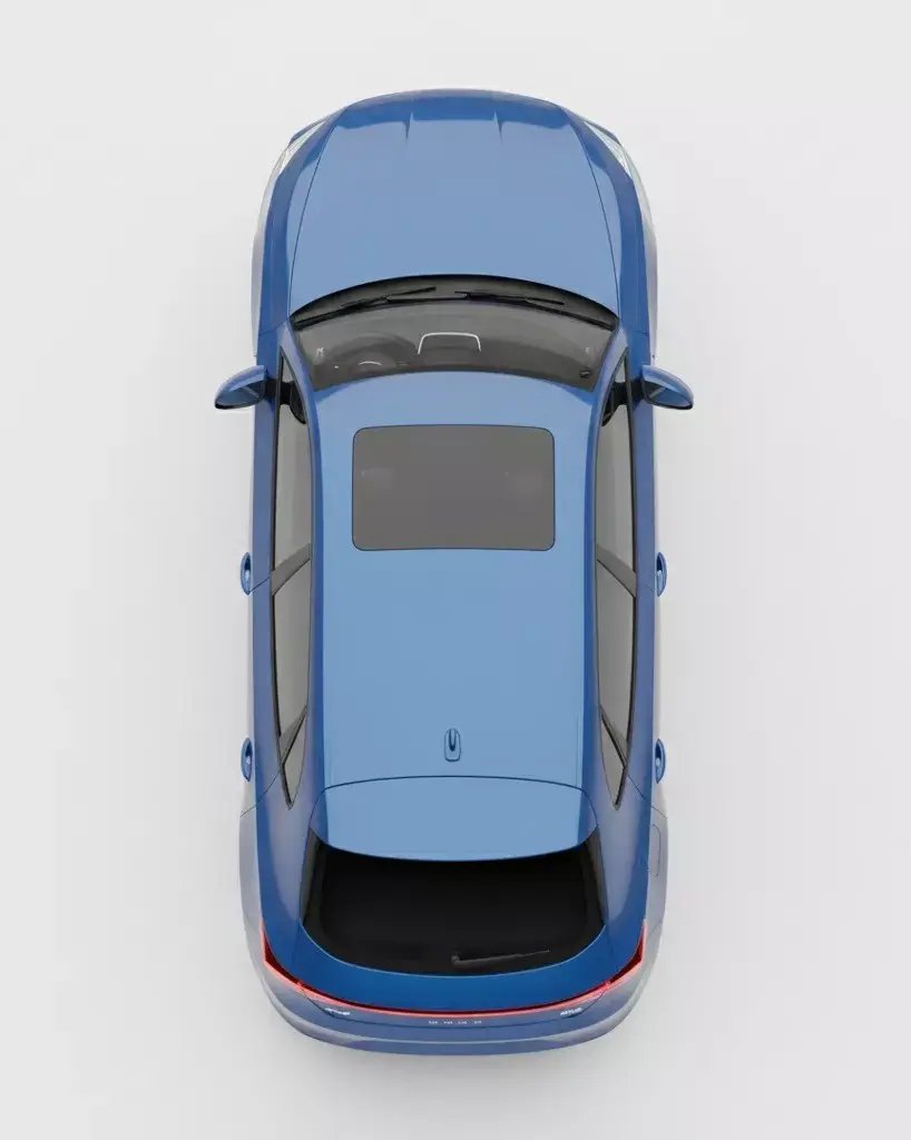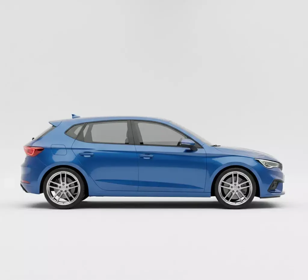 The car's aggressive headlamps integrate sleek LED daytime running lights, giving it a contemporary and sophisticated look. Below the main grille, the bumper incorporates additional air intakes and circular fog lights, enhancing its athletic appeal. The overall aesthetic is one of clean, uncluttered design, typical of a modern European-style compact car. The vehicle is set against a pristine white background, allowing its vivid blue color and intricate details to stand out without distraction. The studio lighting emphasizes the car's contours and reflective surfaces, highlighting its dynamic silhouette.