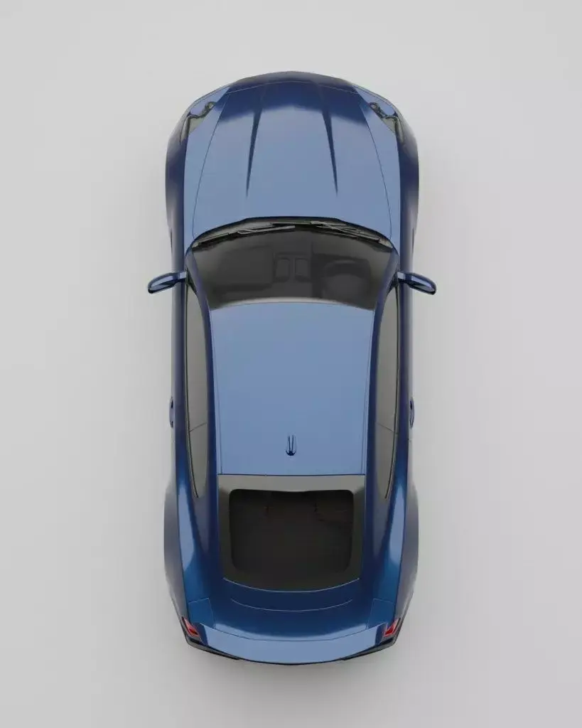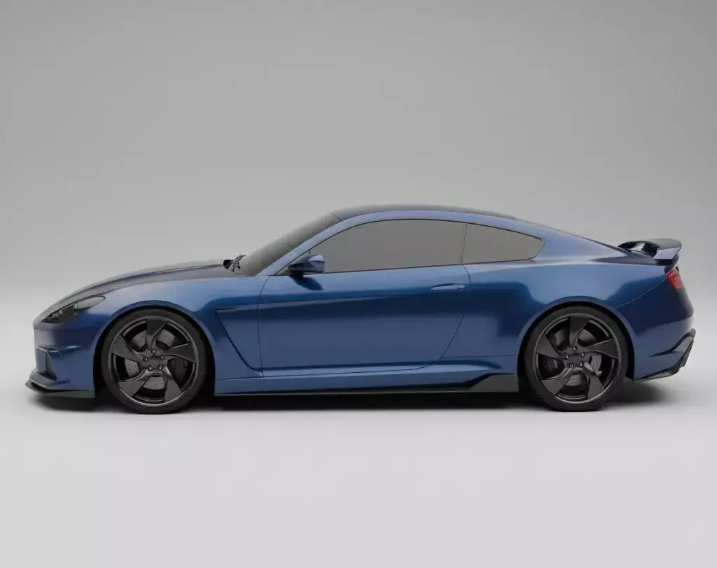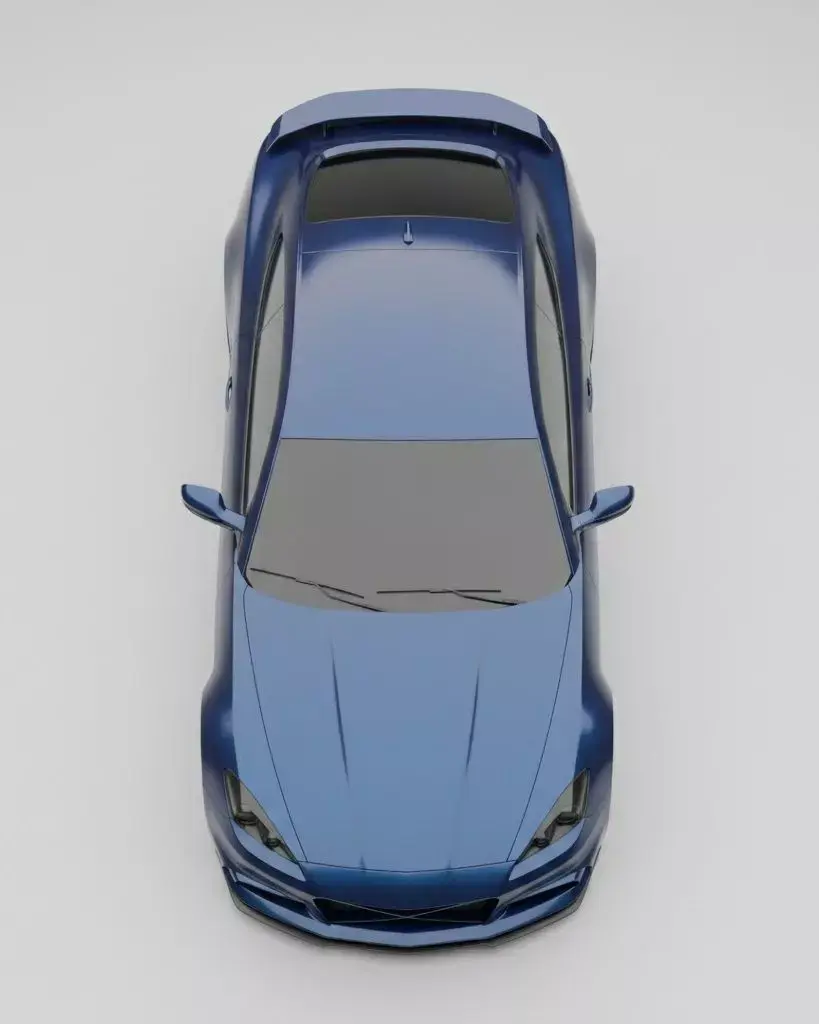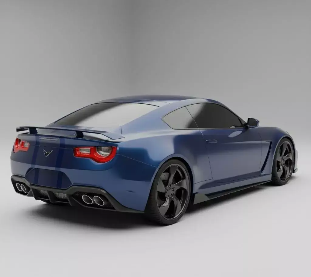 This image showcases a striking blue sports car, featuring subtle dark racing stripes running down the center of its hood. The vehicle boasts a low-slung, aggressive design with a wide, open grille and sharp headlights. Black multi-spoke wheels complement the sporty aesthetic, and its aerodynamic lines suggest high performance. The car is presented from a front-quarter perspective against a clean, light gray background, allowing its dynamic form and details to be the focal point.