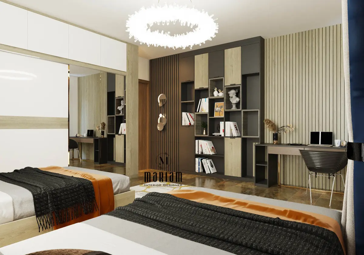 Functional Study Area: The room includes two dedicated study desks with chairs, providing a practical workspace for two.