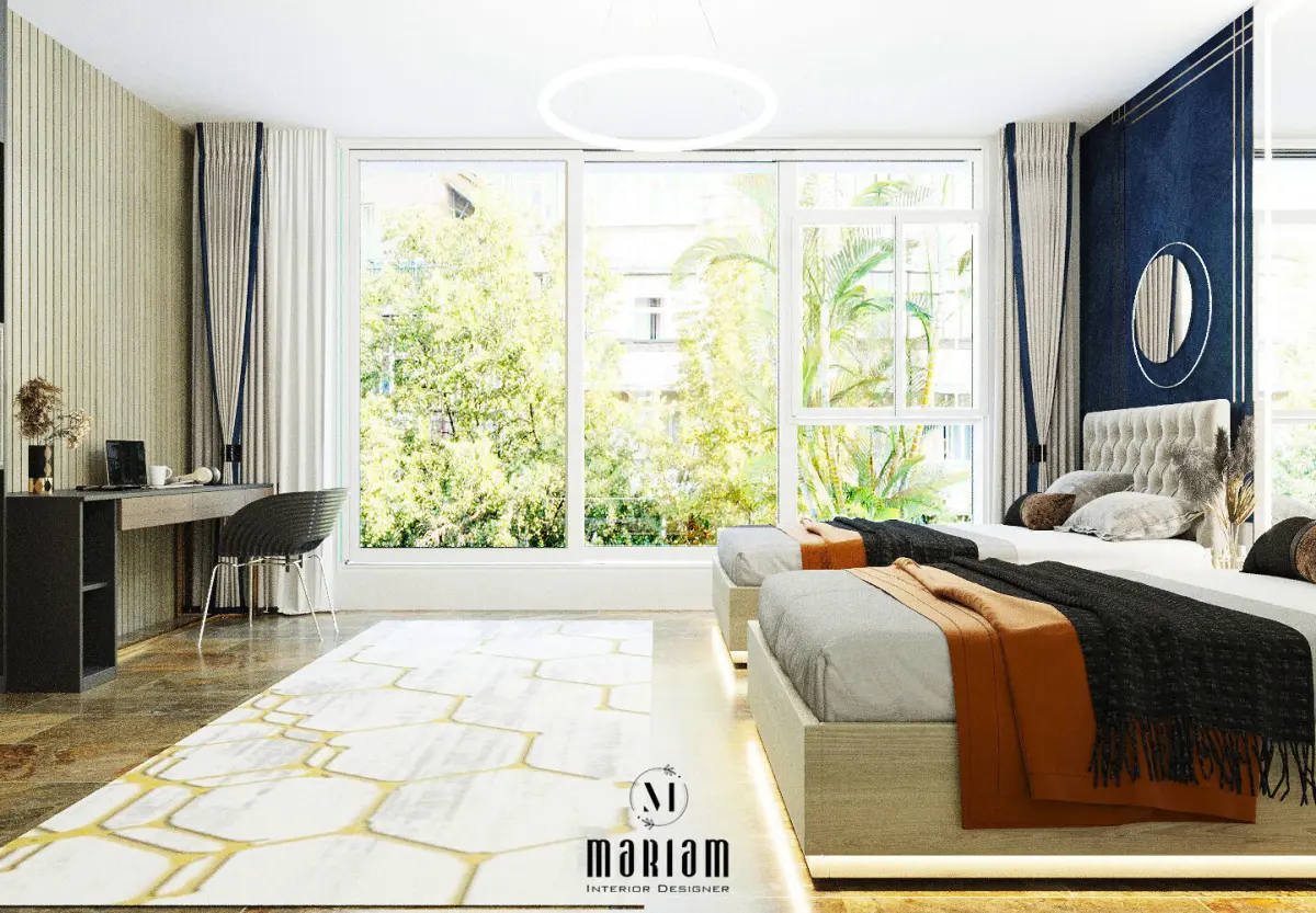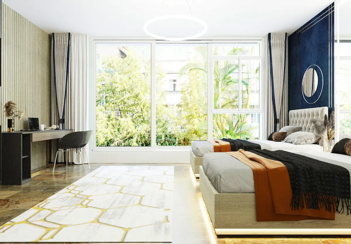 Modern Twin Beds: Two low-profile beds with tufted headboards, featuring integrated under-bed lighting that creates a floating effect and adds to the modern ambiance.