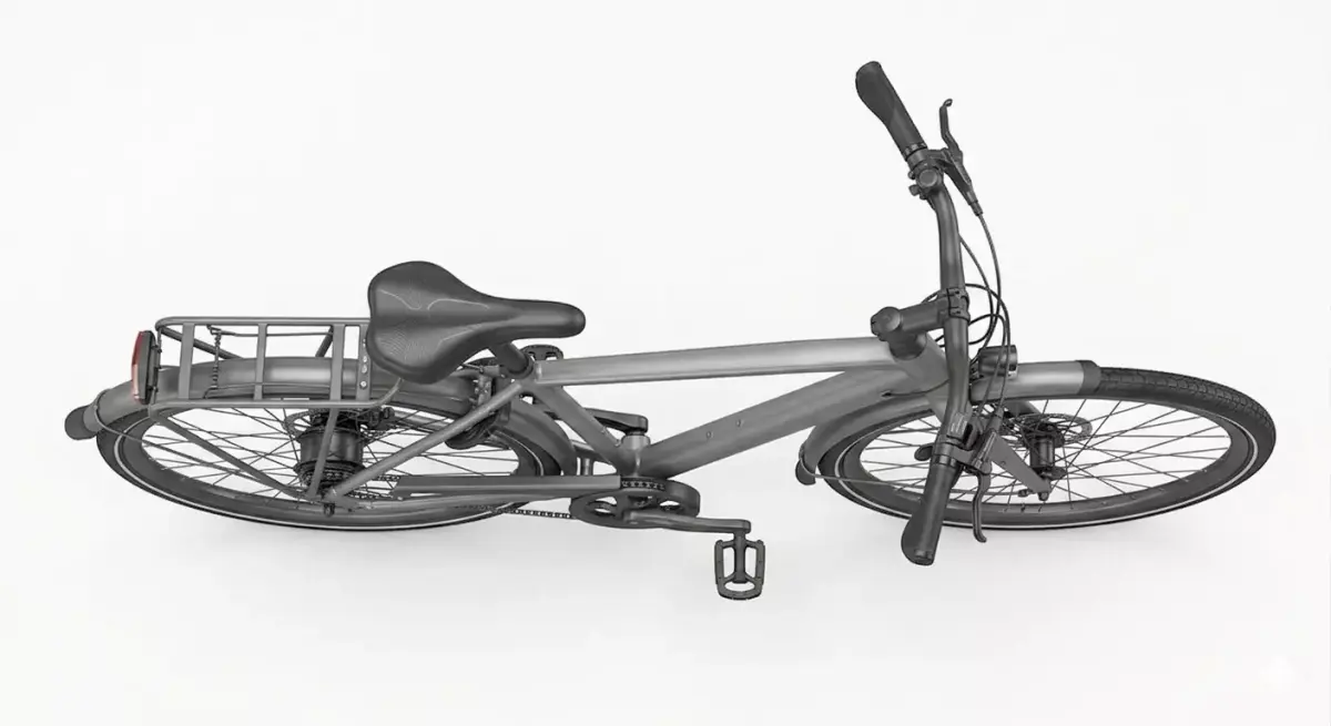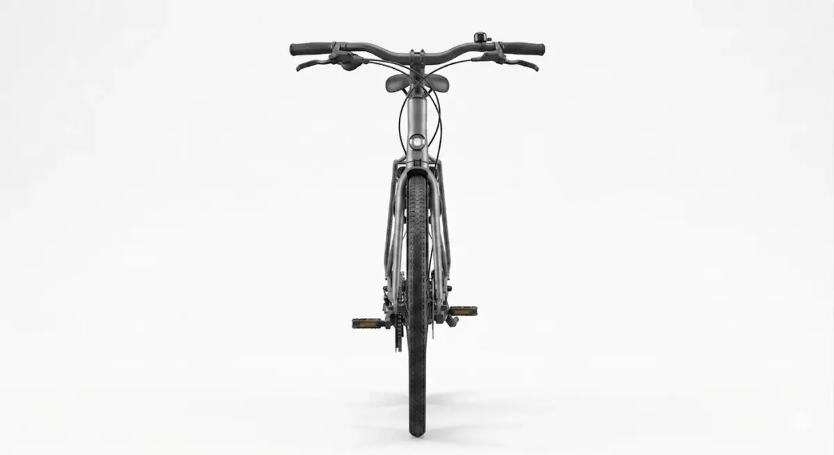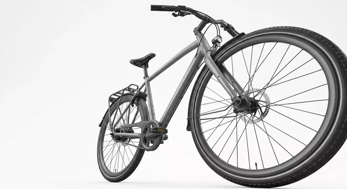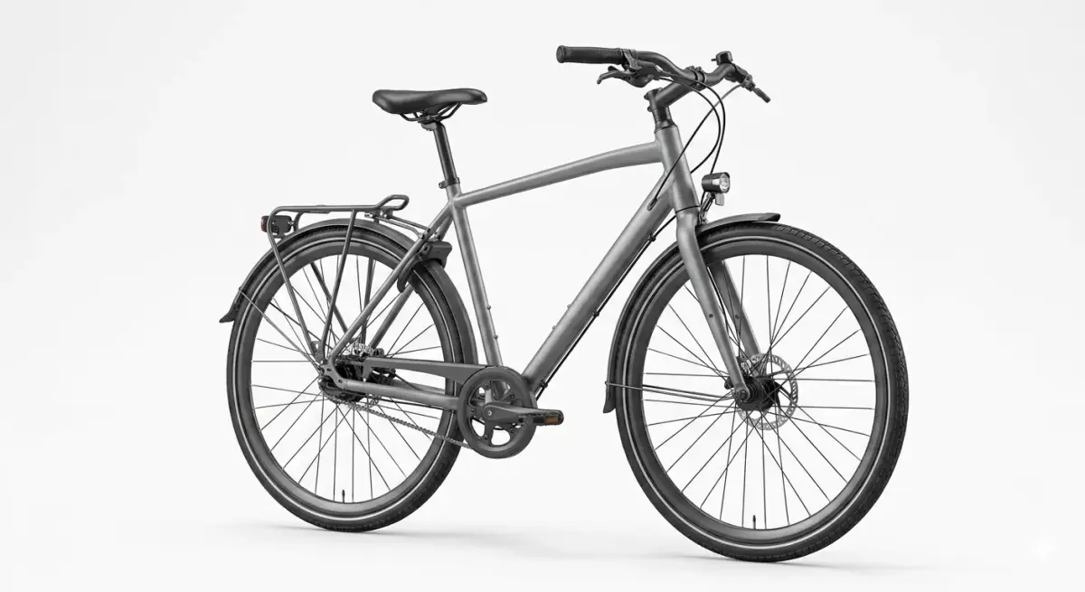 This is a highly detailed 3D render of a modern urban commuter bicycle, presented in a clean studio environment against a seamless white background. The bicycle features a rigid, matte grey frame designed for a comfortable, upright riding position. It is fully equipped for practical city use, including full-coverage front and rear fenders, an integrated rear luggage rack, and powerful front and rear LED lights powered by an internal dynamo or battery system. The bike employs a clean, low-maintenance single-speed drivetrain with a integrated chain guard and efficient disc brakes on both the front and rear wheels for reliable stopping power in all weather conditions. The model showcases meticulous detail, including cable routing and textured components, suitable for high-end product visualization.