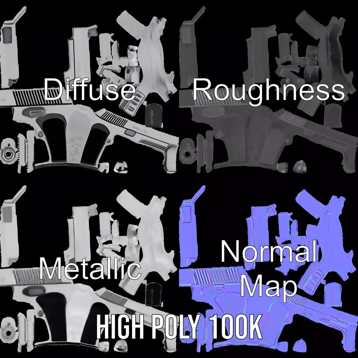 The Sleek Silver Handgun model pack provides a highly detailed and realistic representation of a modern handgun, crafted with precision for diverse applications. Each model has 3 levels of detail: low-poly (1000 triangles for mobile), middle-poly (10,000 triangles for environment), and high-poly (100,000 triangles), which allows for the use of this model in production rendering (such as 3ds Max, Maya, Cinema4D, Blender, Vray/Corona/Cycles, and all other), game engines (Unity and Unreal compatible), and interactive presentations, providing a choice of detail based on the LOD System principle. This model is perfect for use in video games, film production, VR simulations, and military training simulators, offering versatility and realism. The model's textures are PBR, Diffuse, NormalMap, and reflection/roughness/metallic, which are suitable for any modern rendering engine. All models are accurately unwrapped and have no overlapping UV. All textures are 4096*4096 in size. If you liked the model, please like and leave a comment.