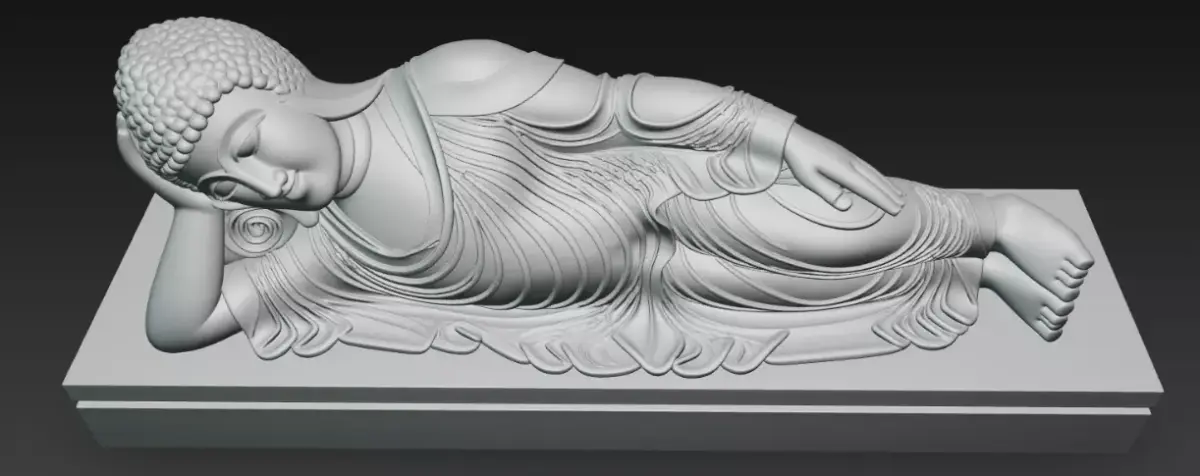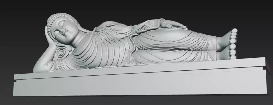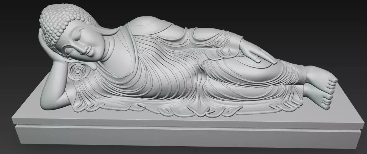 Sleeping Buddha Statue 3D Model For 3D Print. A finely detailed 3D-rendered reclining Buddha statue, depicting a serene figure in a peaceful repose with flowing robes, resting on a rectangular base.