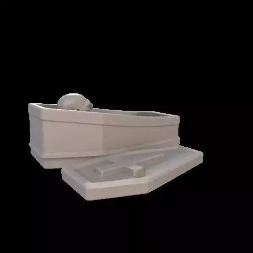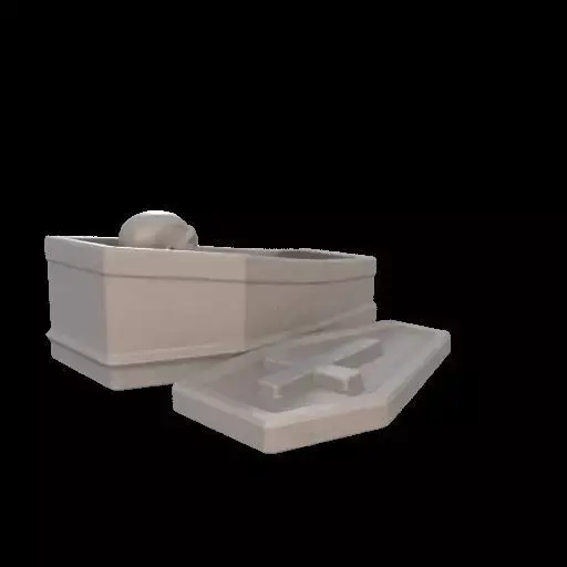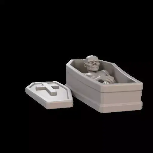 A 3D printable mini coffin trinket box featuring a zombie figure inside, as if settling down to sleep. The zombie has a relaxed, slightly curled posture, with arms resting naturally and head lowered. The coffin has a hollow interior designed for reliable 3D printing, with smooth, reinforced geometry supporting both the coffin and zombie. Compact, sturdy, and optimized for tabletop display, with a flat base for stability. Gothic and spooky design, perfect for Halloween decoration or collectible display.