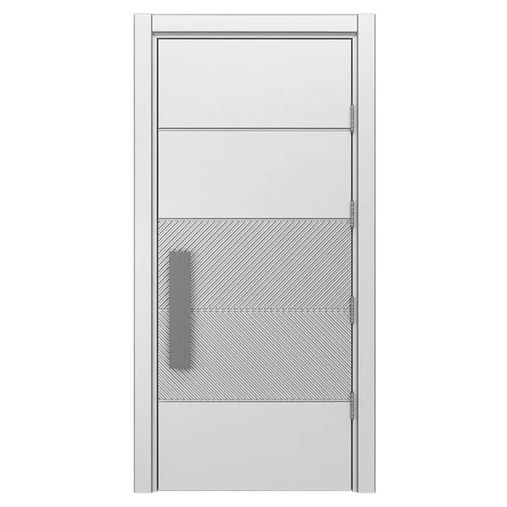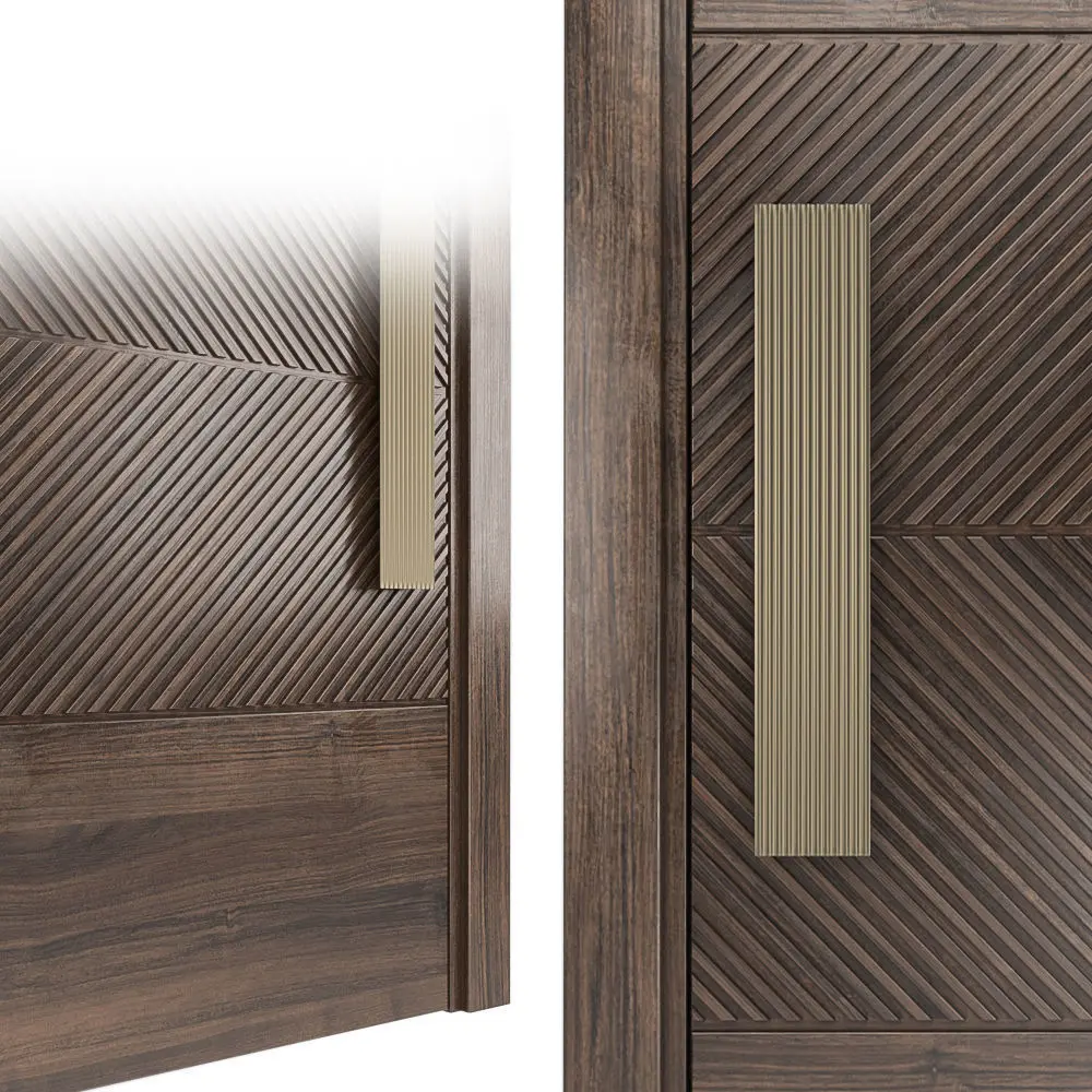 A custom door design with horizontal panels of rich select grade wood provide top and bottom framing to dual interior panels featuring our Lecate variegated texture. Rendering shown in walnut
