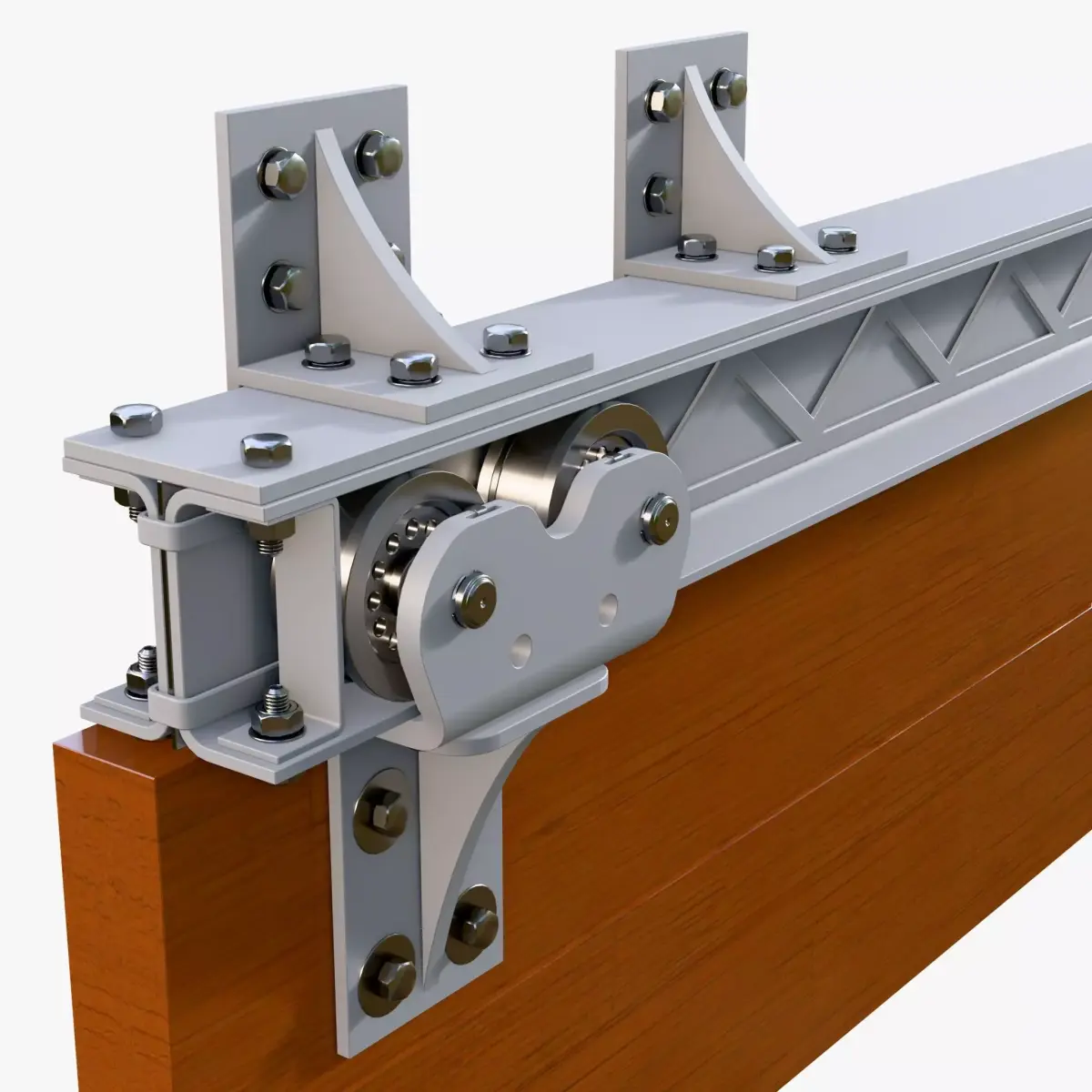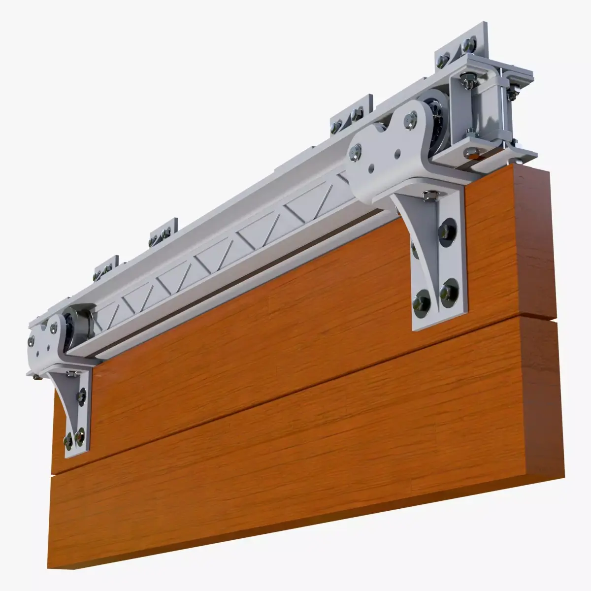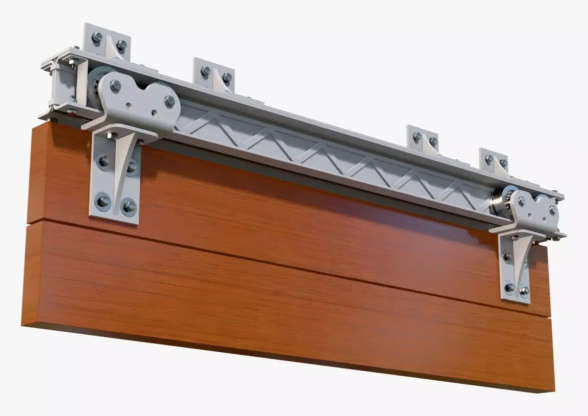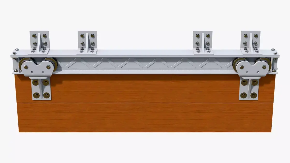 Sliding door guide mechanism with a wooden panel. The structure includes a load-bearing beam, roller carriages, and mounting brackets.