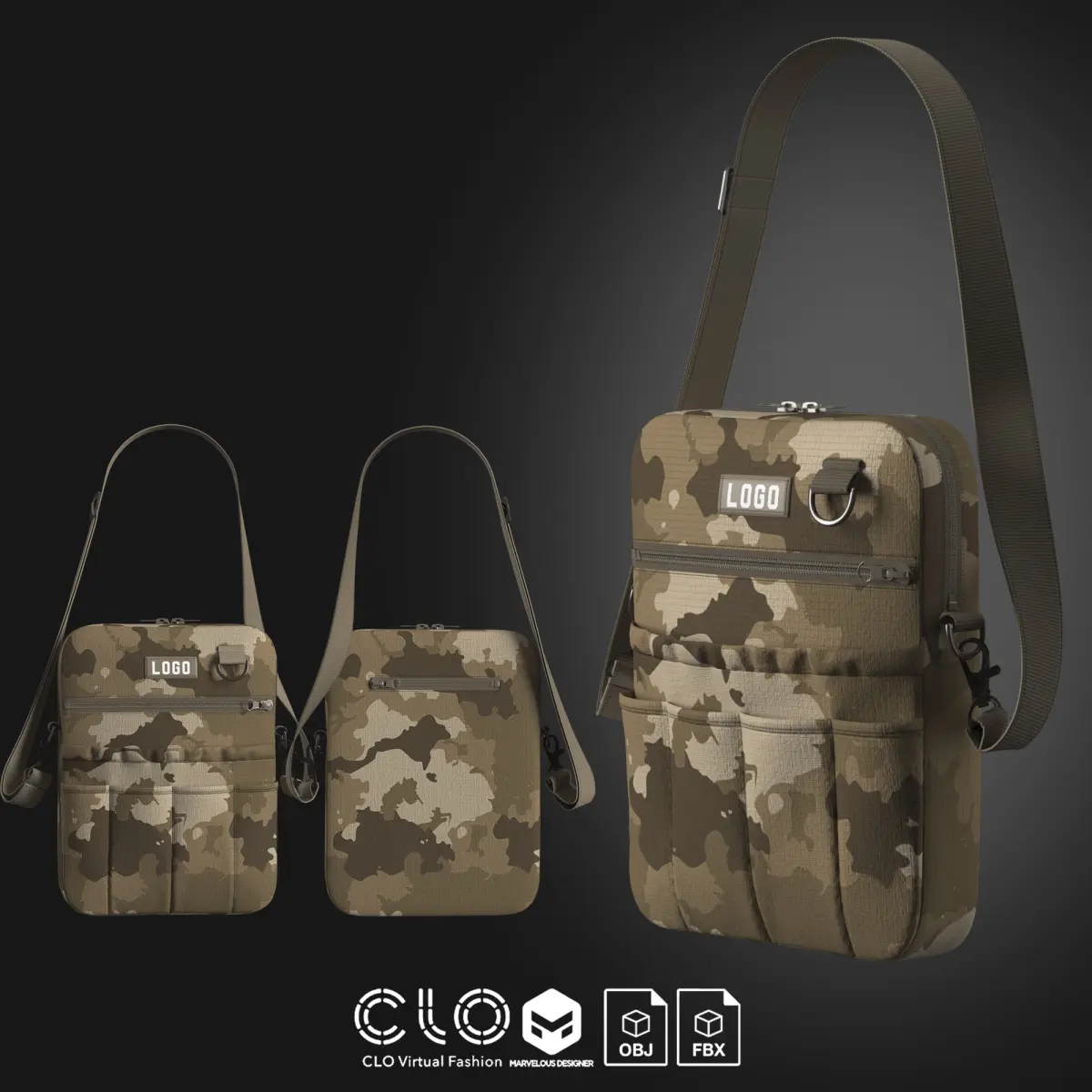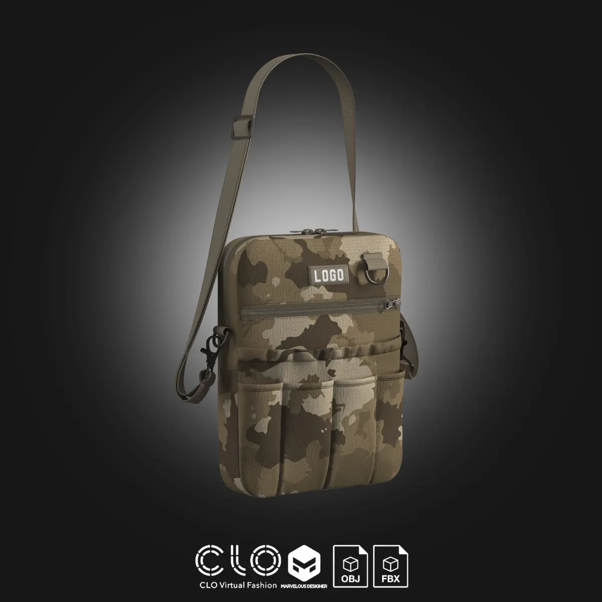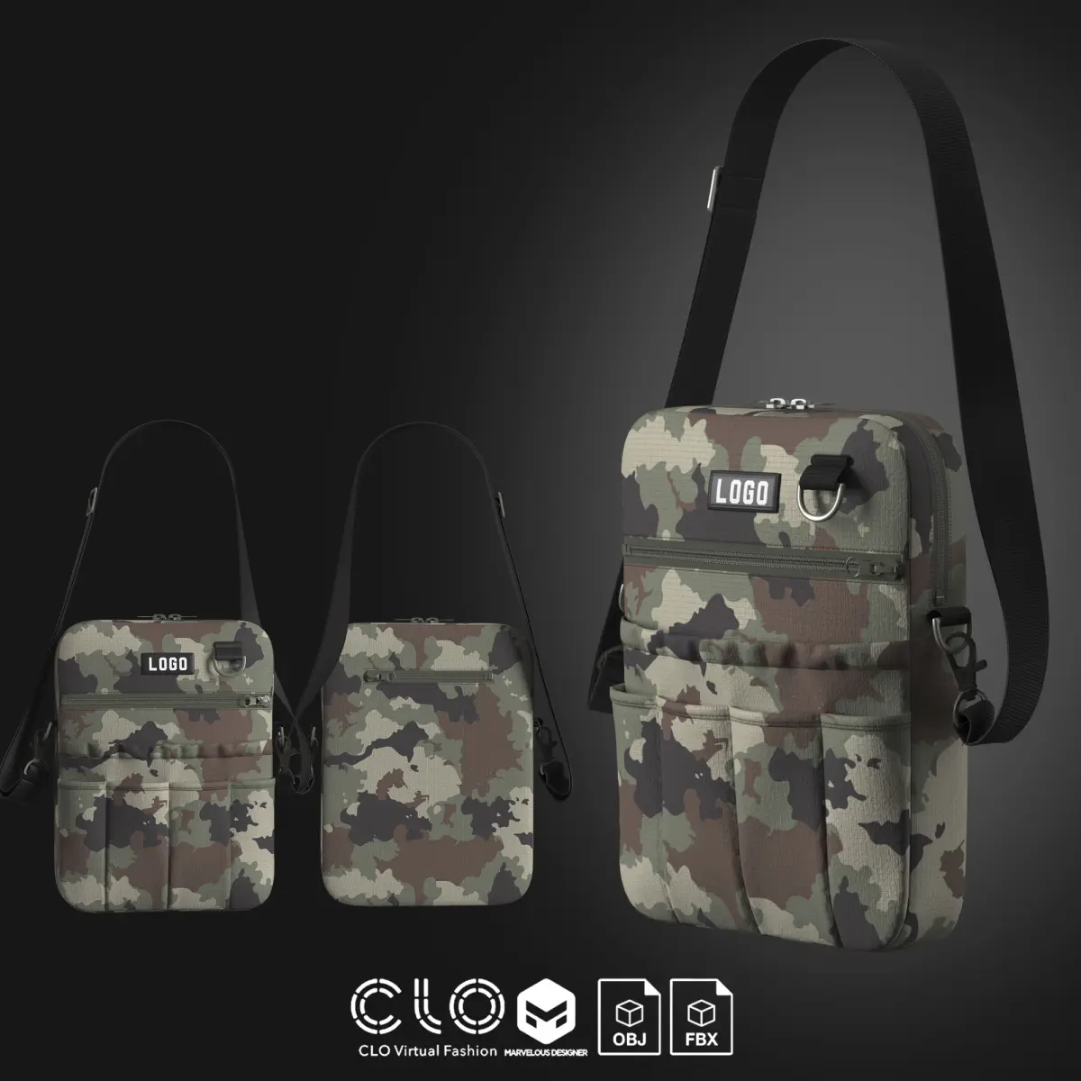 This asset can be useful for designers looking to explore camo/streetwear styles or for 3D artists needing fashion-forward accessories with a utilitarian look. The bag silhouette is modern and adaptable to different digital contexts.