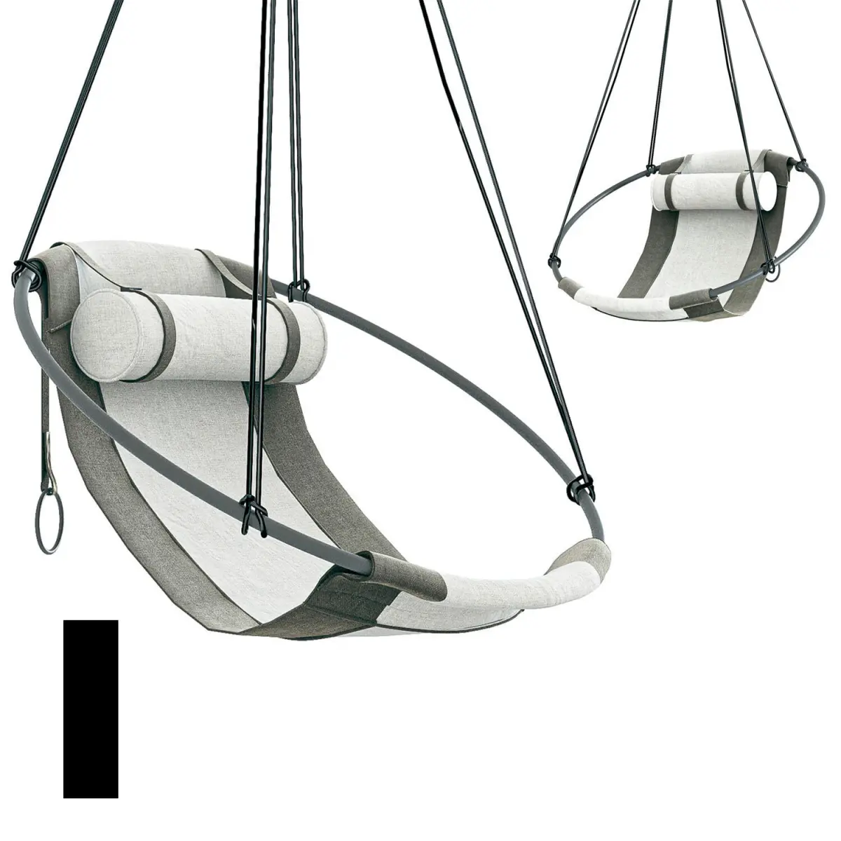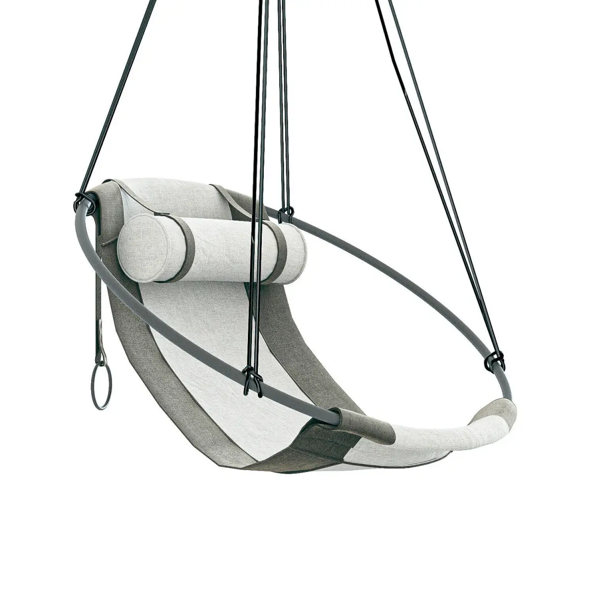 The SLING OUTDOOR hanging chair swing seat is crafted with Spradling Silvertex material – a highly sustainable environmentally-friendly vegan material. Stripped away from all excess, this hanging chair has a circular frame with the sheets of fabric hanging loose within it, to create a sleek, sexy, and oh so comfortable experience.