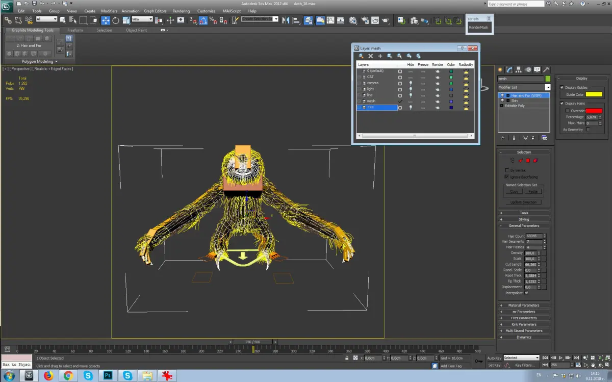 3ds max,low-poly modelUnwrappedtexture 1024/1024rigged with CAT/ape/ and skin modifyHair and Fur modify for coat2 animation layers-walking and climbDirectional light with mental ray shadow mapYou can easy change the style of the coat with hair and fur modify