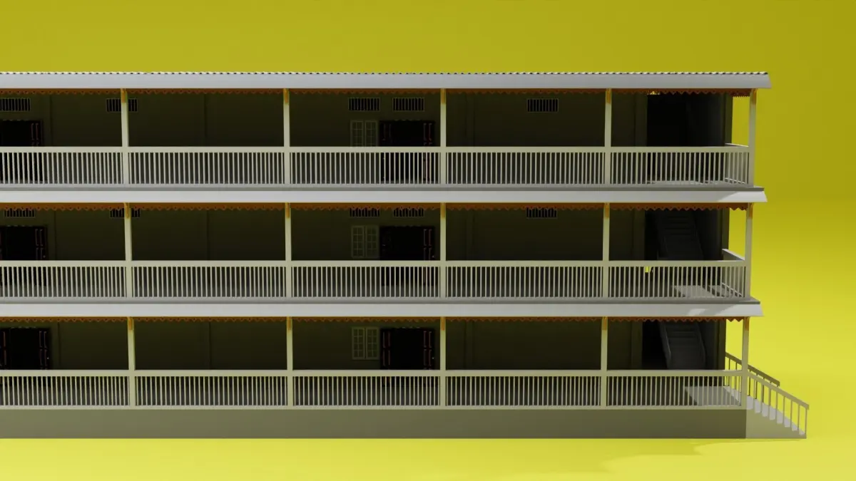 Slum Area building without textures.....You can add your own textures..... Exported in .OBJ .FBX ... Model is built in 1:1 real world scale and grouped by element. Some base materials and textures provided.....Windows,columns,doors,walls are separately foldered....Height of each floor is 2'7''..Stairs are provided as you can see in the picture....Some detailing design is there.... Model is of the exterior only making it ideal for use in: